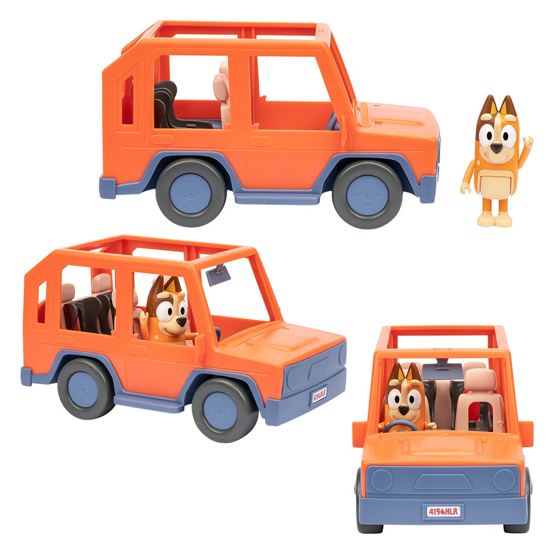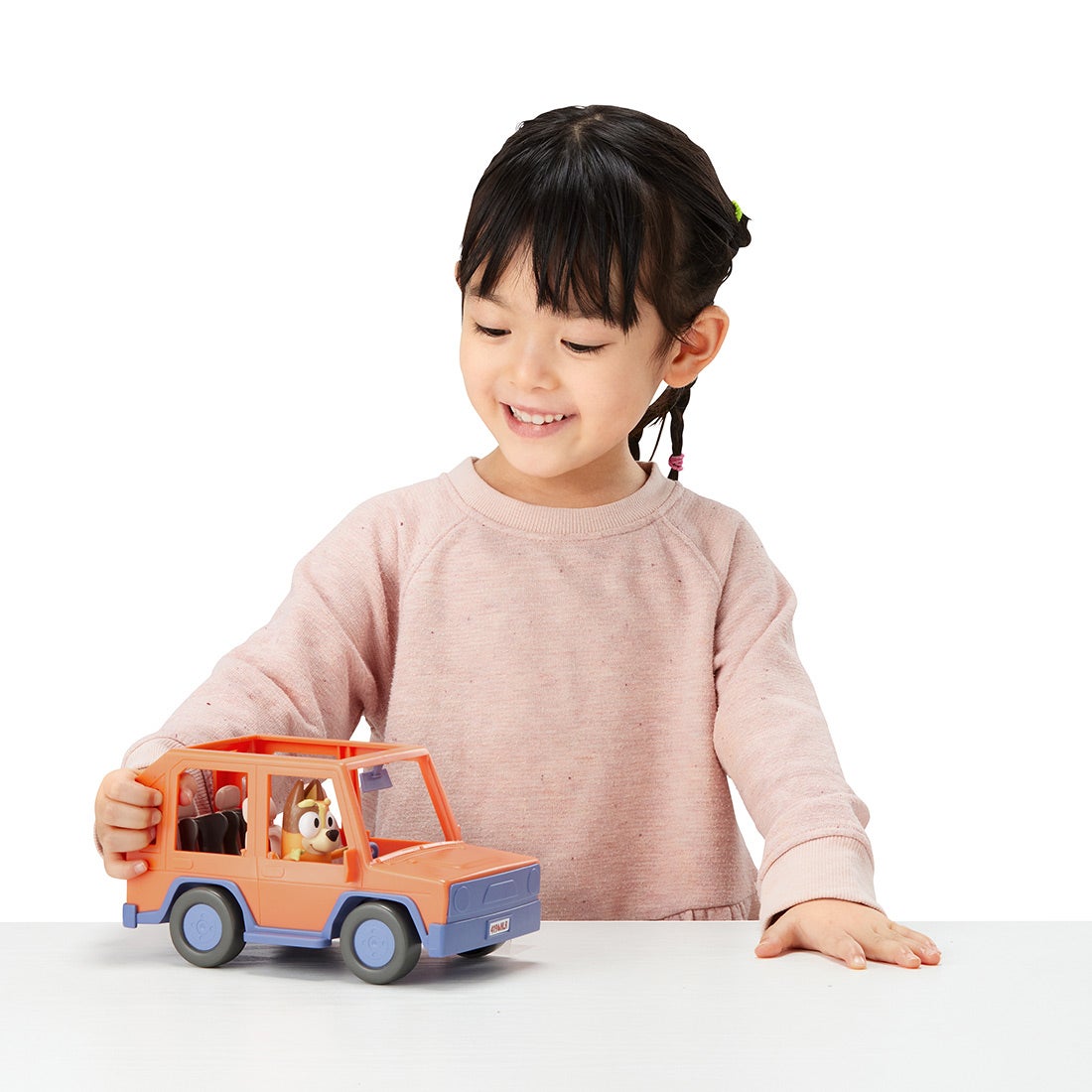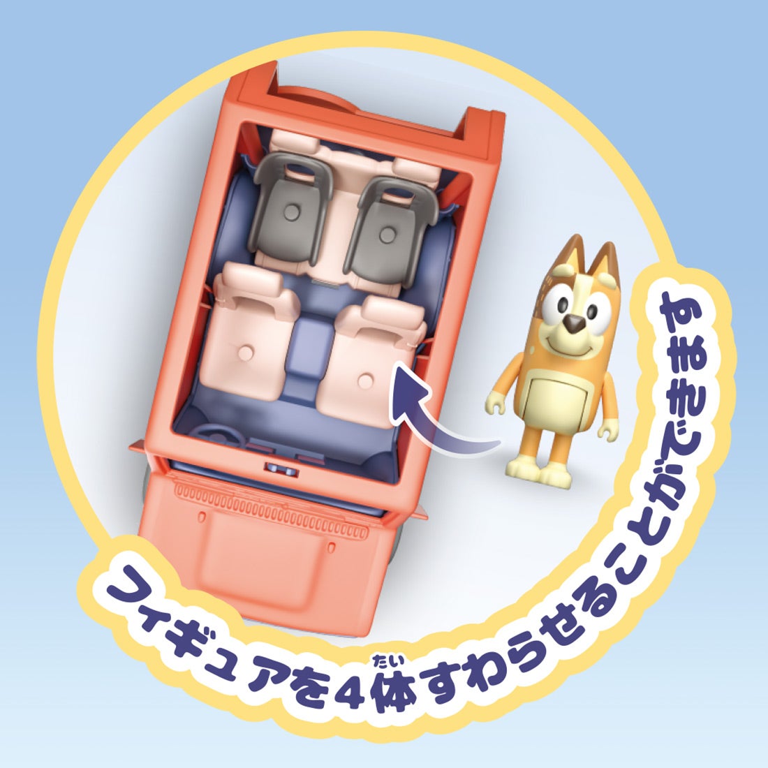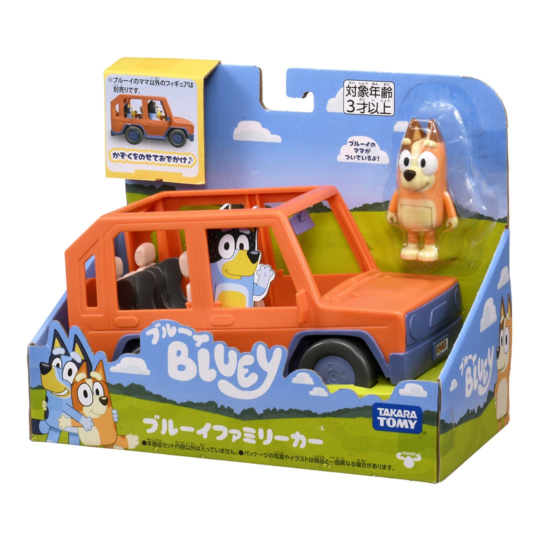 ブルーイファミリーが乗る4WDカーです。ママのフィギュア1体がついています。 フィギュアを最大4体すわらせることができます。 別売りの「ブルーイファミリーフィギュアセット」と一緒に遊べます。