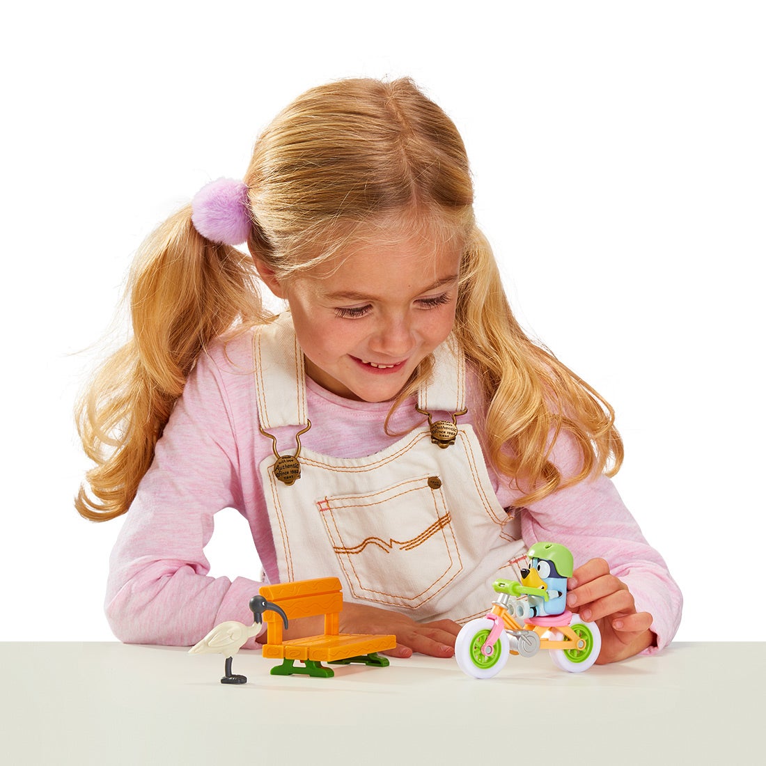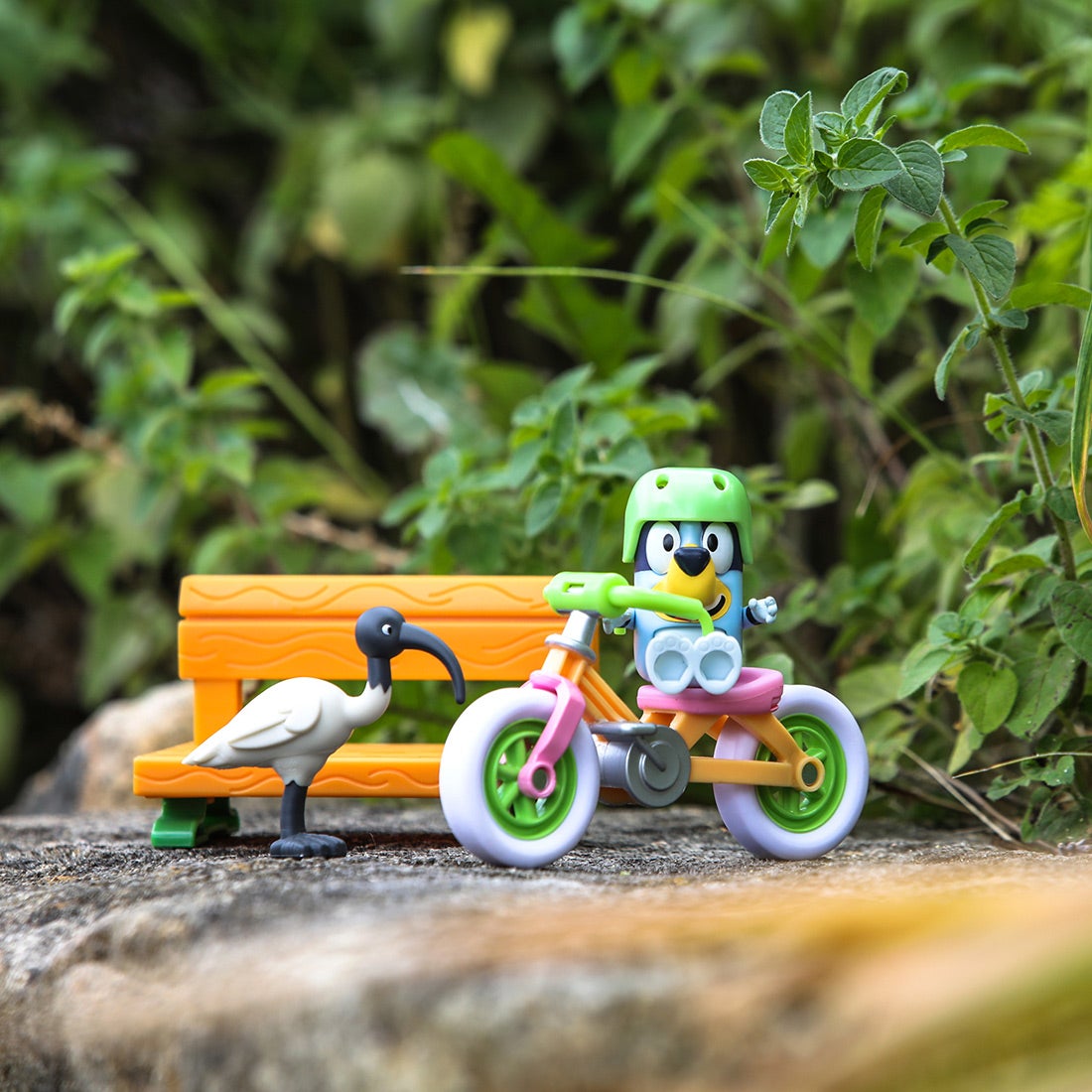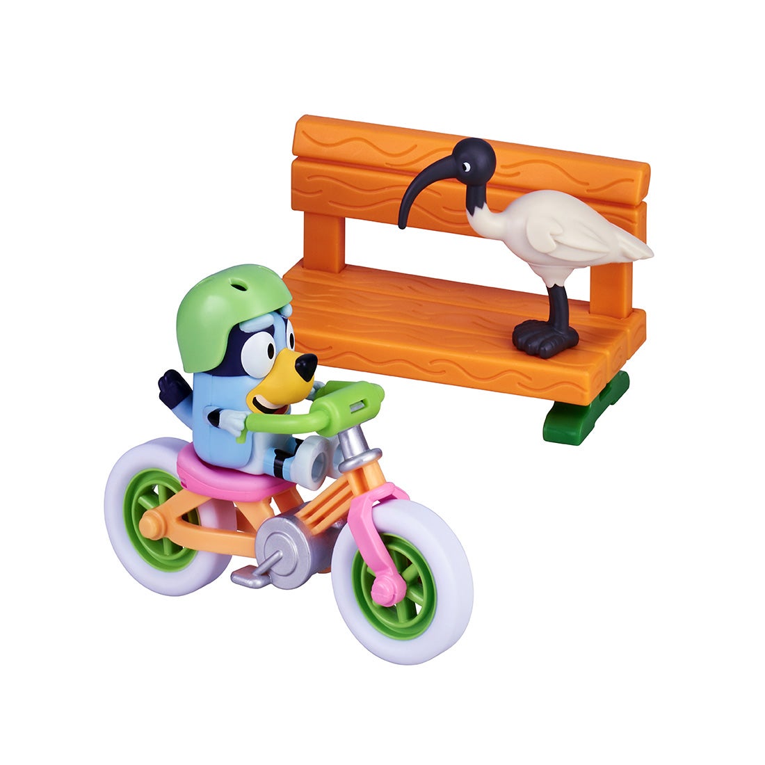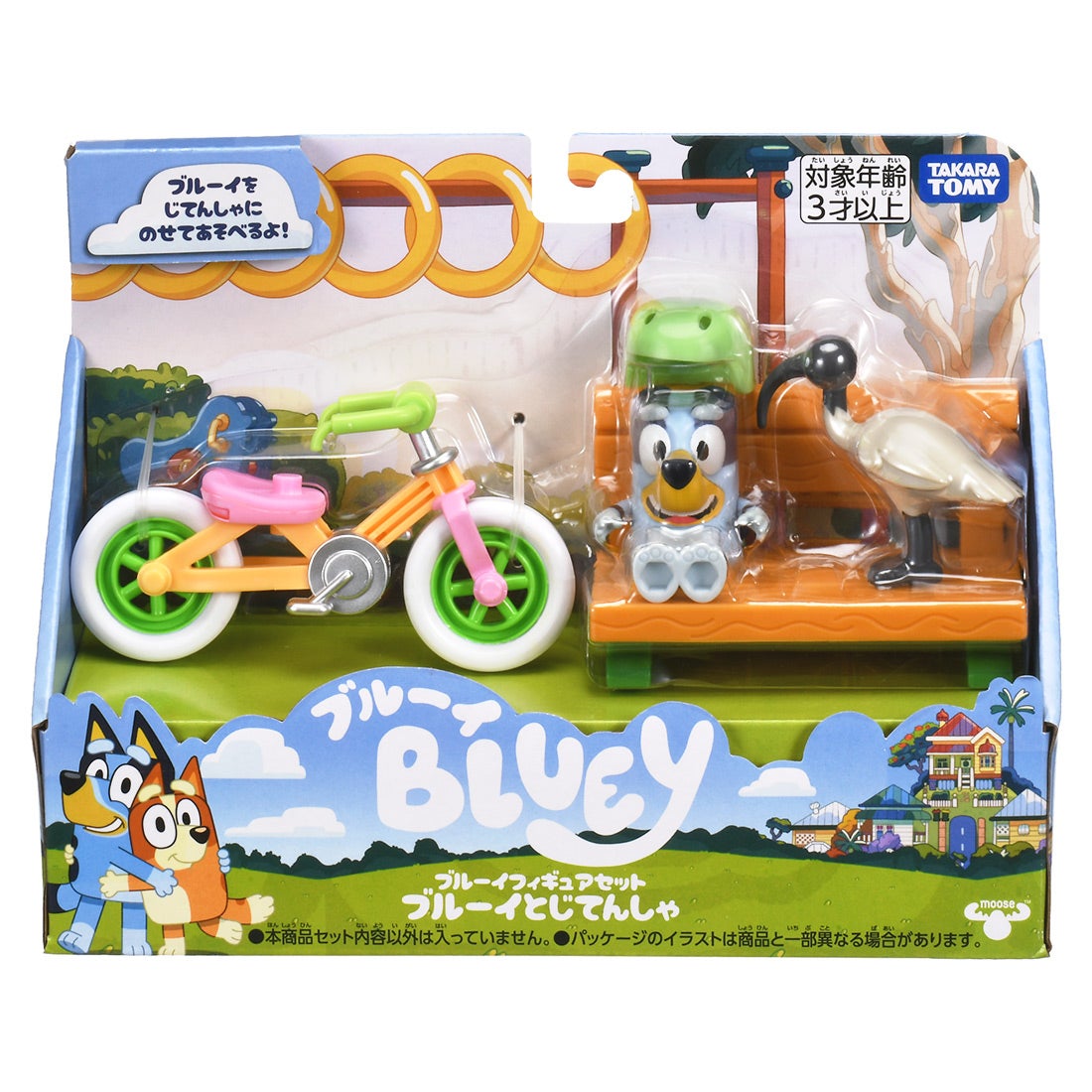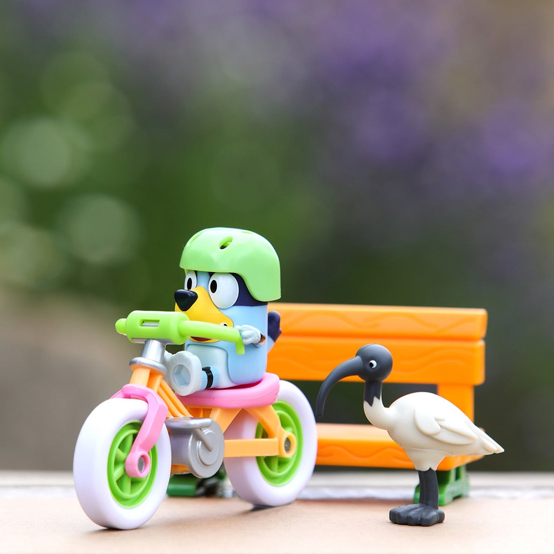 アニメのエピソード「じてんしゃにのろう」をイメージした、ブルーイのフィギュアとヘルメット、じてんしゃ、ベンチ、鳥のセットです。