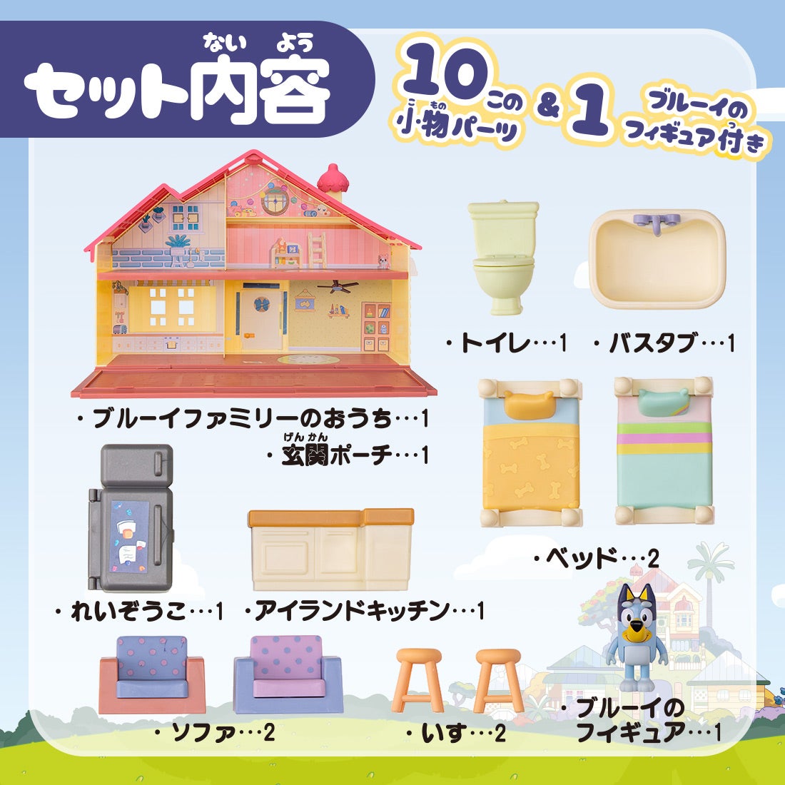 トイレや冷蔵庫、ソファなどの家具が10個とブルーイのフィギュアが1体ついているので、すぐにブルーイごっこが楽しめます。