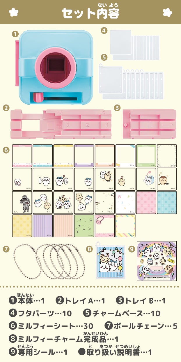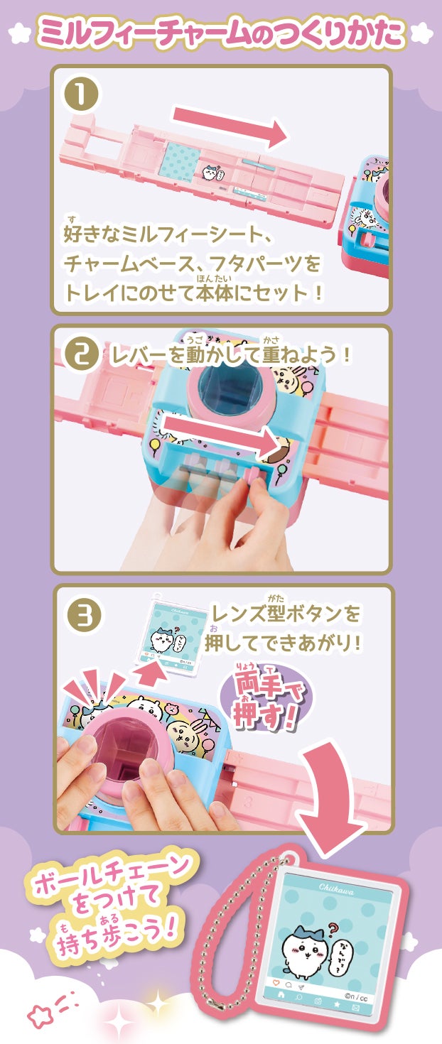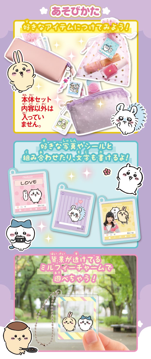 好きな写真やシールと組み合わせたり、文字が書けるミルフィーシートを組み合わせて、アレンジが楽しめるよ。さらに!背景が透けてるミルフィーチャームも作れちゃう!