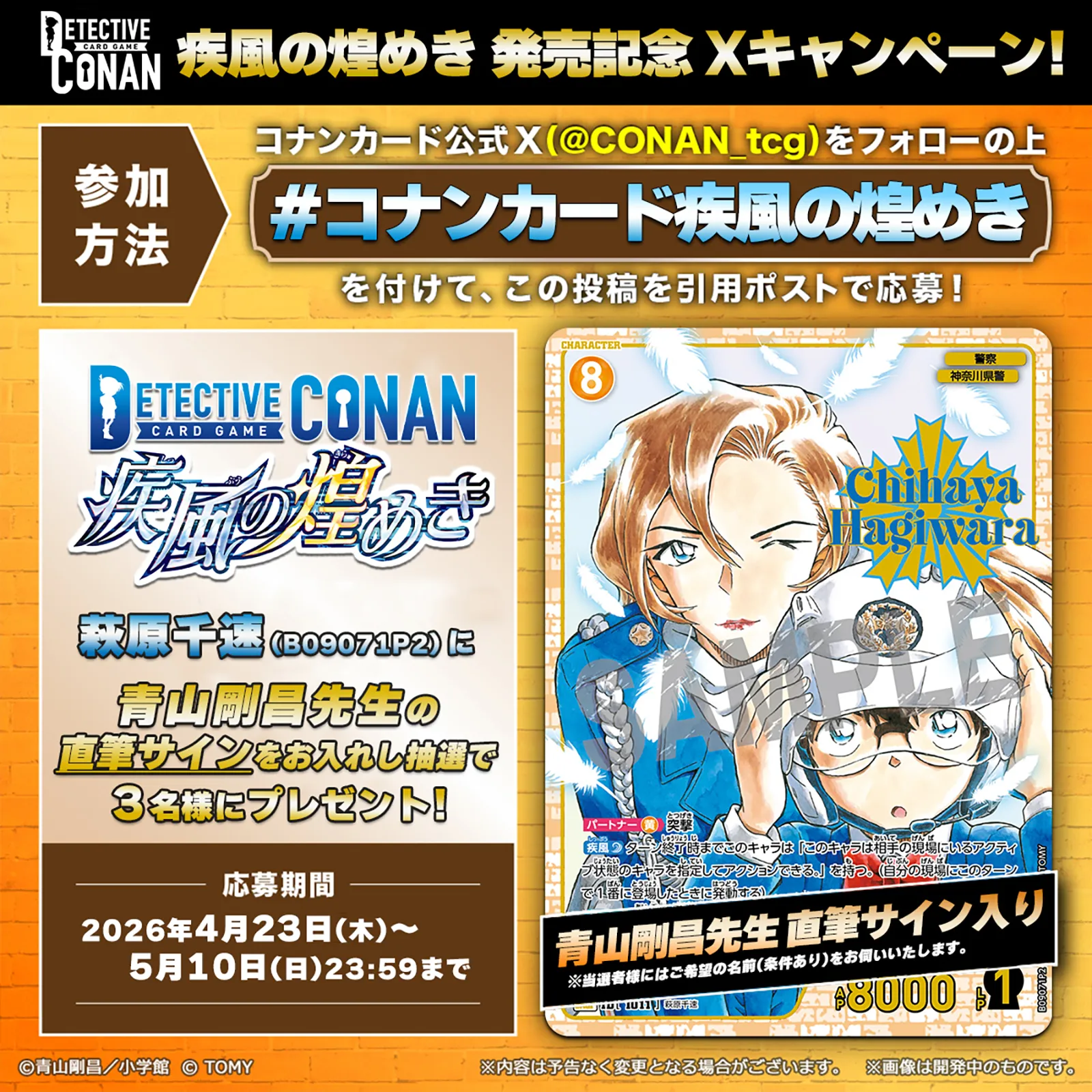 「名探偵コナンカードゲーム公式X(@CONAN_tcg)」をフォローの上、対象の投稿にハッシュタグ「#コナンカード疾風の煌めき」を付けて引用ポストしてください!