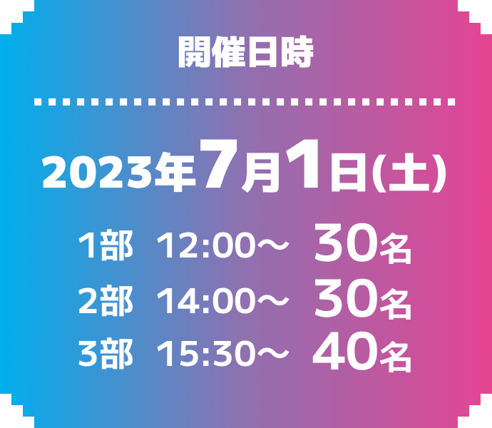 - 各回開始時間より45分後にはその回のイベント参加券の配布を終了させていただきます。