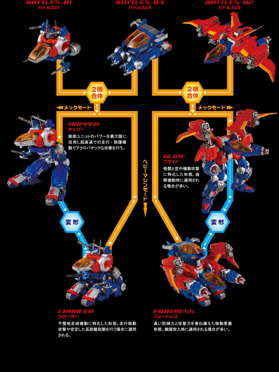 ダイアクロン隊の汎用主力戦闘マシン:ダイアバトルスシリーズの最新後継機。3機合体システムと優れた空中機動力は初代モデルから脈々と続くダイアバトルスシリーズのDNAを継承。モデルチェンンジ毎に新しい戦闘機能が追加されており、最新モデルのV(Variable)シリーズでは敵との交戦中、1部のマシンユニットが破壊・損傷などにより機動不能となった場合でも、形態を変化させ戦闘続行を可能とする<可変戦闘システム>が搭載されている。