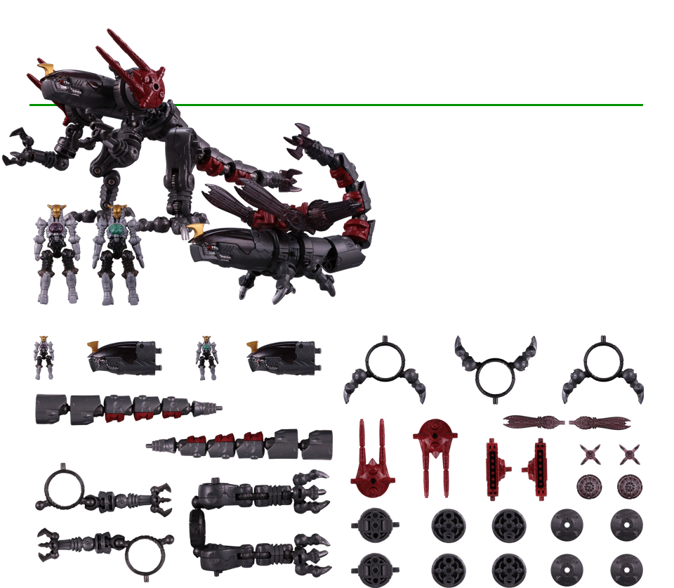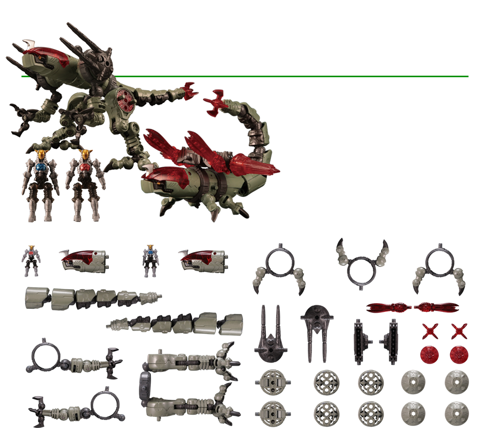 コックピットユニット×1個、本体A×1個、本体B×1個、前脚部ユニット(右) ×1個、前脚部ユニット(左) ×1個、後脚部ユニット(右)×1個、後脚部ユニット(左)×1個、尾パーツA×1個、尾パーツB×1個、、ジョイントパーツ×1個、ワルダロイド×1体、取扱説明書×1冊、パンフレット×1冊