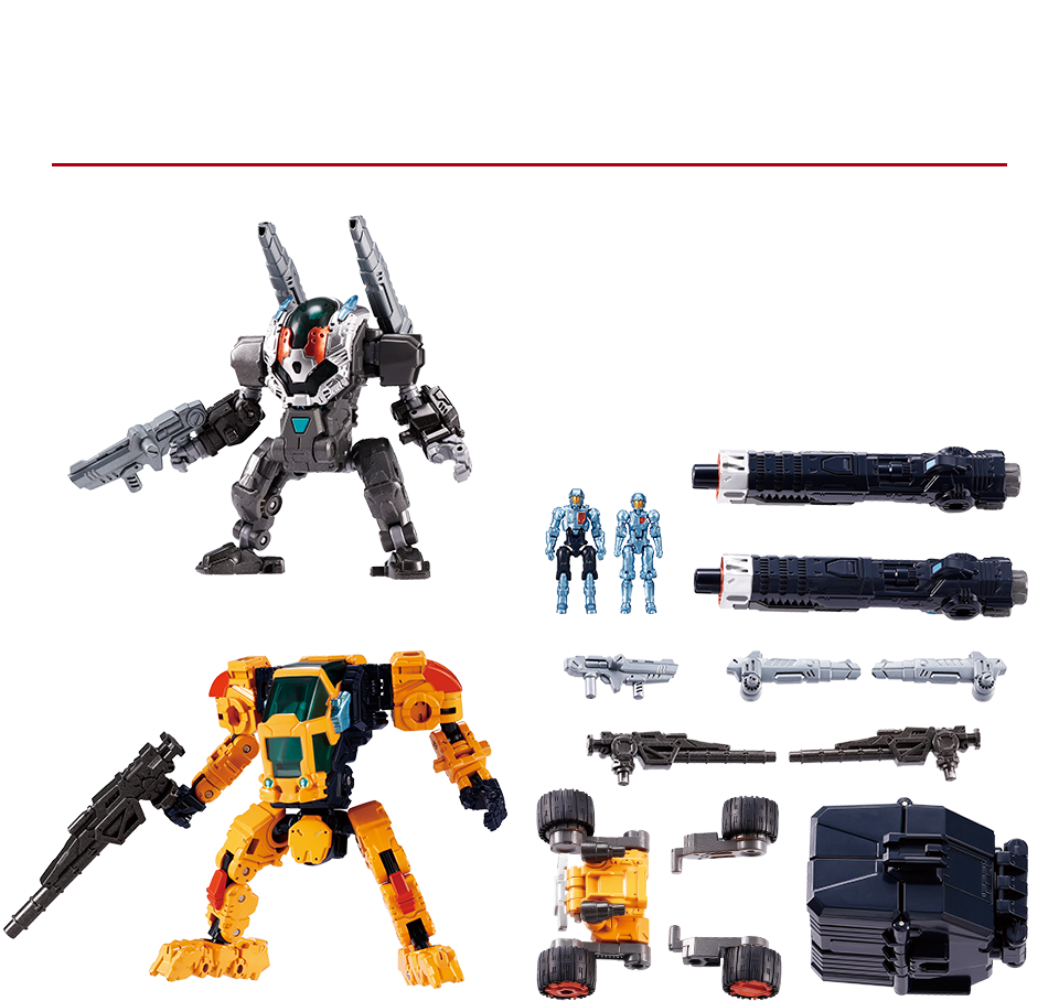 DA-112 ダイアバトルスV2<バトルス01> バトルス01(胴体部)X1、武器AX4、武器BX2、武器CX2、ダイアクロン隊員Ver.2.0X1、取扱説明書X1、パンフレットX1 DA-113 ダイアバトルスV2<バトルス02> バトルス02(翼部)X1、腕部パーツX2、バトルス02コックピットX1、剣X2、剣用ジョイントパーツX2、ダイアクロン隊員Ver.2.0X1、取扱説明書X1、パンフレットX1 DA-114 ダイアバトルスV2<バトルス03> バトルス03(脚部)X2、バトルス03コックピットX1、戦闘バイクX1、ダイアクロン隊員Ver.2.0X1、取扱説明書X1、パンフレットX1