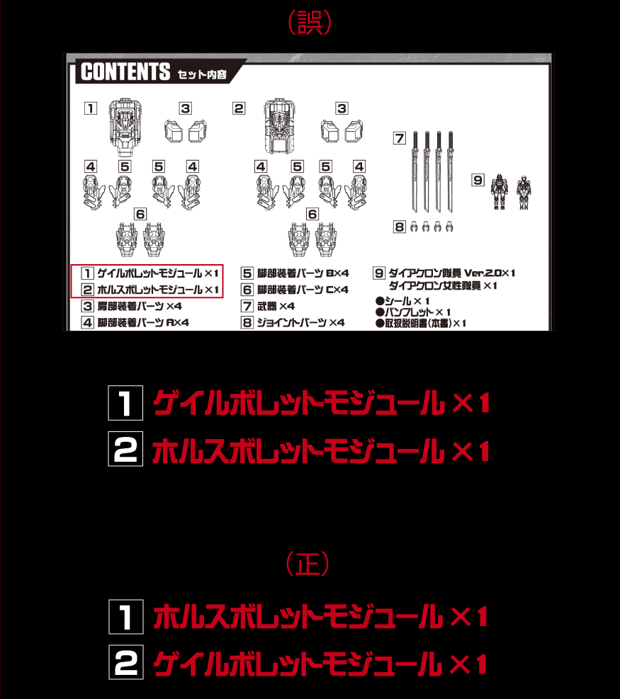 2025年1月下旬発売「EXコア&アーマメントセット3」(JAN:4904810946540)の取扱説明書において下記の通り誤りがありました。
