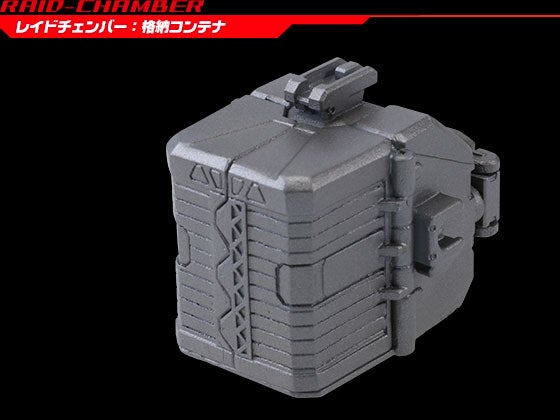 レイドチェンバーはパワードスーツを格納し搬送する為の格納ユニットだ。 外殻は対爆・耐衝撃構造壁で覆われ、内部にはパワードスーツの拡張用兵装一式を収納可能。 レイドチェンバーには空挺用・陸送用等の仕様があり作戦によって選択運用される。 空挺用の左右連結器下にはスラスターが装備されており着陸時や緊急離脱時に起動する。 防壁兼連結用のオプション:シールドユニットでチェンバー同士を連結し簡易的な防御コロニーを構築する事も出来る。