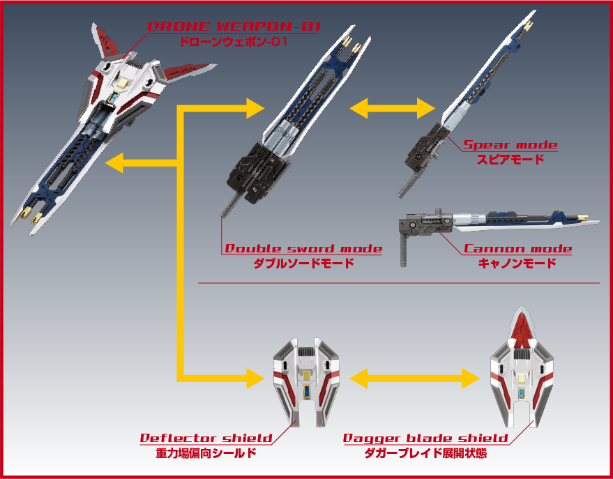 ドローンウェポン-01の保持型武装モード。ソード型の切断/砲撃武装とシールド型の攻撃防御武装に分離。切断/砲撃武装は両刃大剣状のダブルソードモード、分離状態のスピアモード&キャノンモード等、状況に応じて可変運用する。ダブルソードモードでは刺突攻撃と砲撃を併用したゼロ距離刺突砲撃が可能となる。攻撃防御武装は重力場偏向フィールド展開機能を備えたダガーブレイド内蔵のシールドとなる。シールドには試験運用段階の次元転送切断攻撃を無効化する転送プロトコルキャンセラー搭載型モデルも存在する。