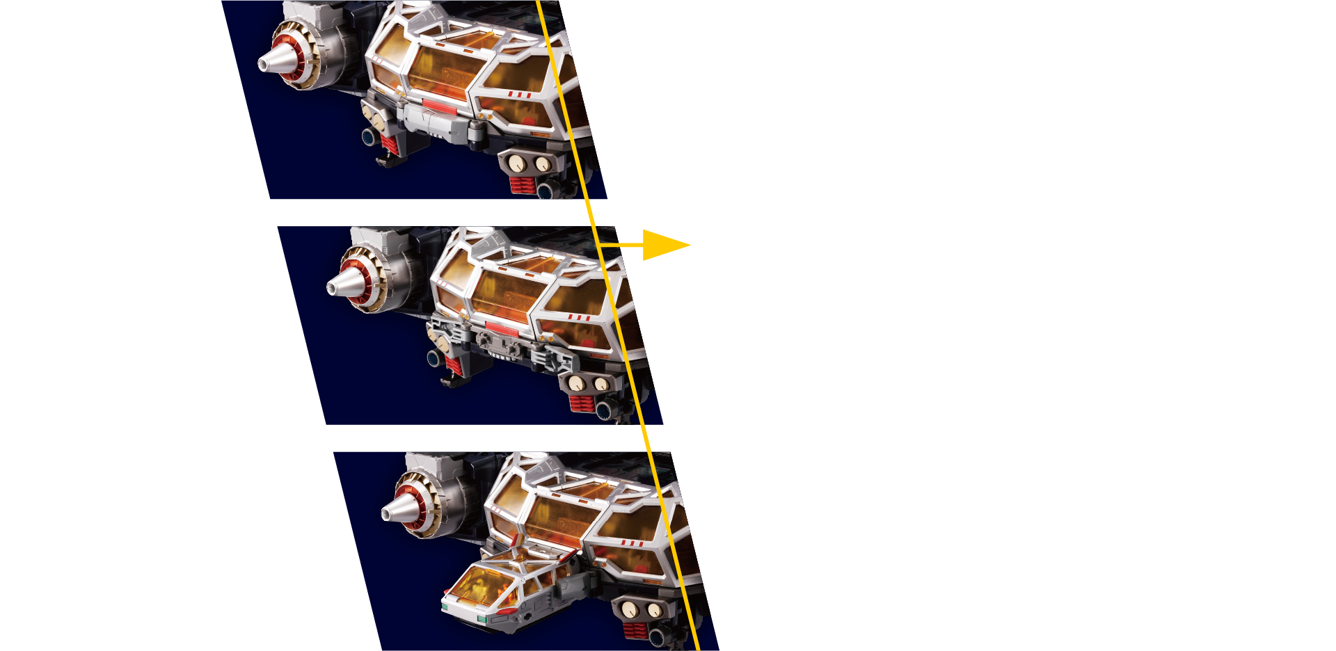 空中機動要塞モード/空中空母モード時には上開き展開。キャノピー部全体の脱着も可能。