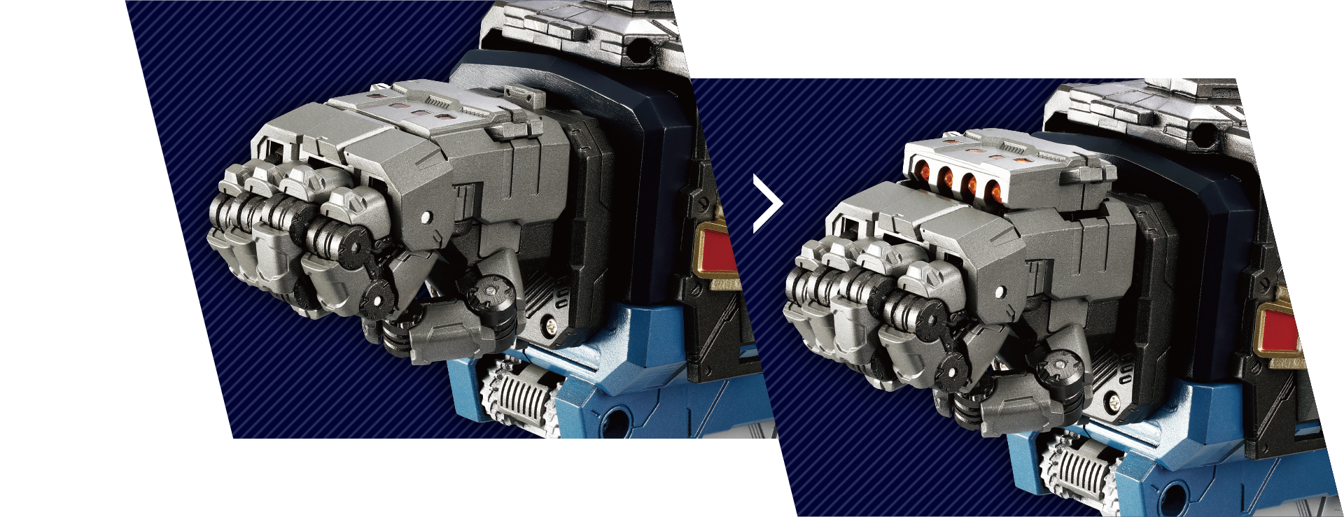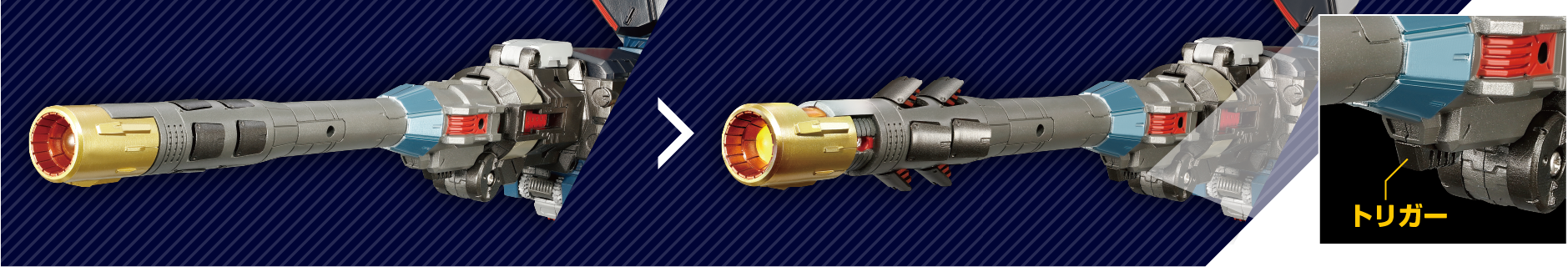 銃身下部のトリガー操作と連動して銃口部の集光効果による発光と8枚の放熱パネルが展開、フリーゾンビームキャノンの発射イメージを演出。
