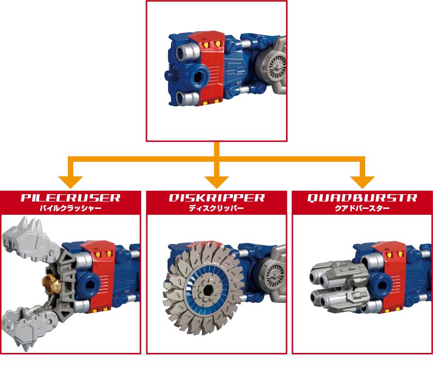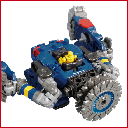 ヴァースライザー3号はヴァースマシンの格闘戦闘機能を強化するパワフルな重機型戦闘マシンだ。先頭部にVムーバー03、中間部にレールランチャーユニットを備え、後部は単独で隊員が搭乗する双腕型重機ビークルとして運用が可能。2基のパワードアーム<エクゾガントレット>の先端武装は交換式で 超圧撃砕クロー、超硬度光子カッター、4連至近爆砕砲の3種の武装アタッチメントを状況に応じて使い分けるのだ。アームユニットとして人型形態のトライヴァース機へ強化接続する際は 背部のアームマウントベースに基部のエナジーユニットを接続、両腕に多関節構造の外骨格型パワードアーム<エクゾガントレット>を保持する形で完成する。全てのトライヴァースシリーズに接続可能で腕の動きにフレキシブルに追従するパワードアームを駆使した凄まじいパワーの格闘戦闘機動で敵を完全破壊するのだ。