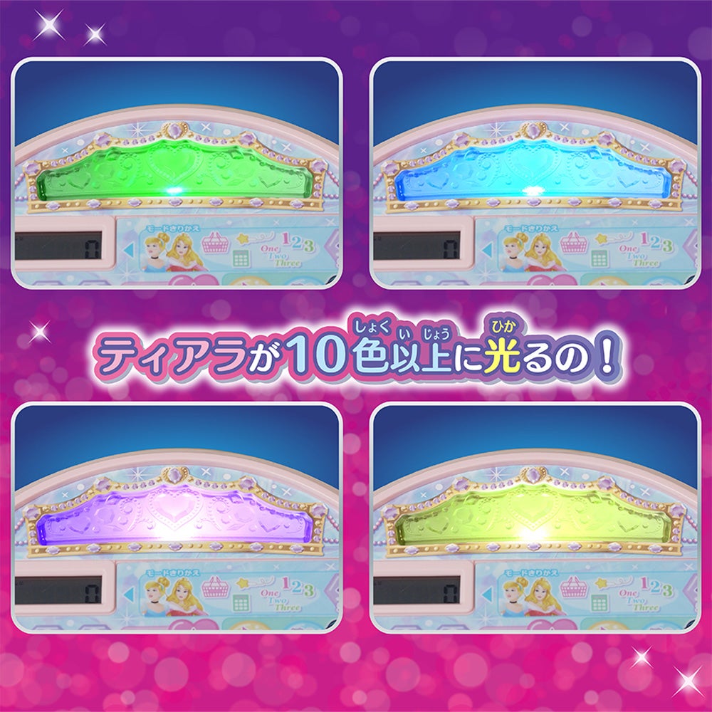 - プリンセストークボタンで、ディズニープリンセスたちそれぞれのイメージカラーにティアラが輝き、自己紹介やメロディ・おしゃべりまで楽しめます。