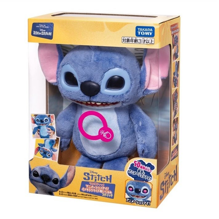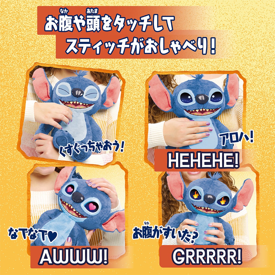 - おなかと頭のタッチセンサーと、揺らしたり逆さにするなどの動きに反応して、LCD(液晶)のアニメーションアイやおしゃべりでスティッチがこたえてくれる!