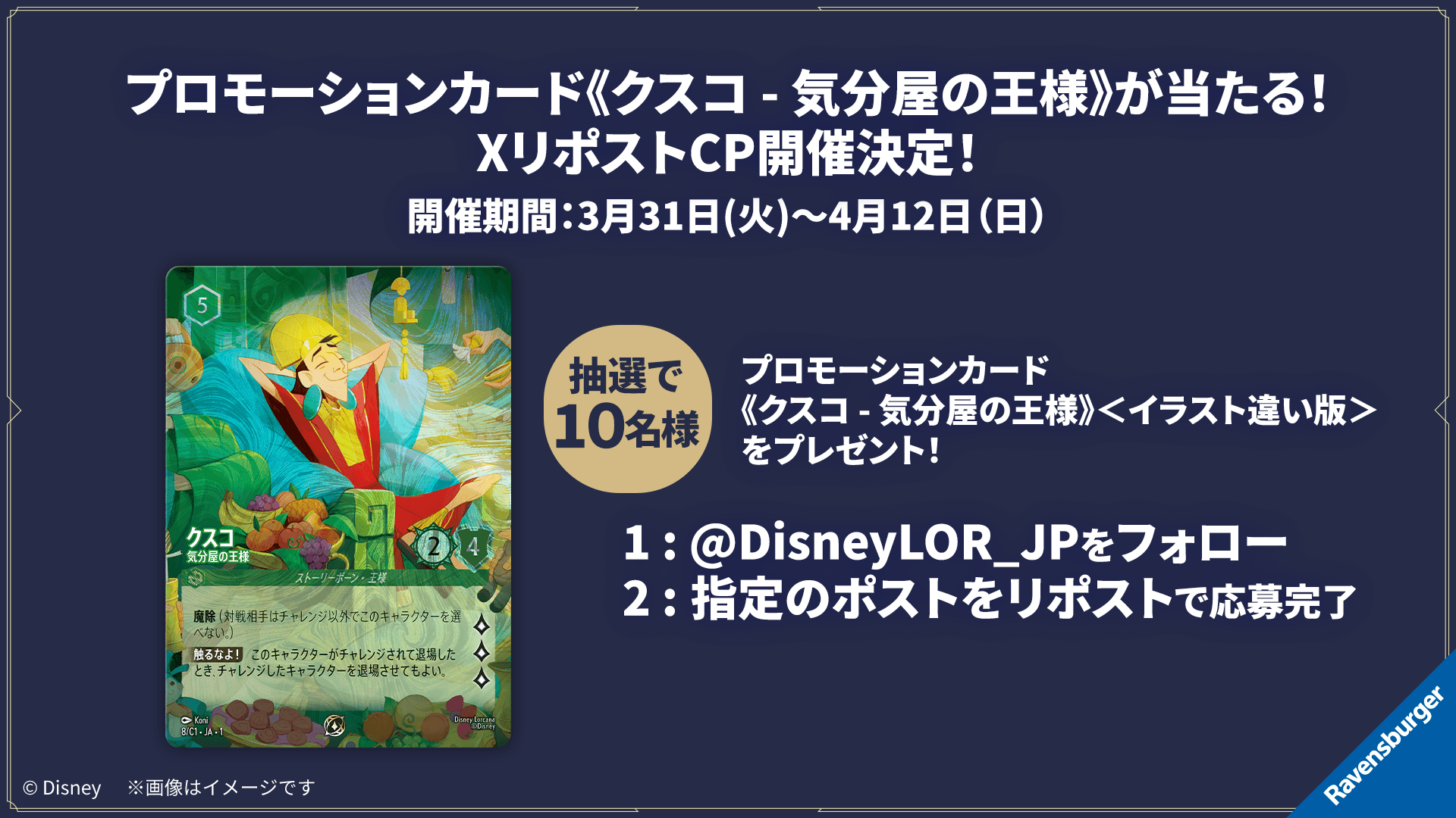 「ディズニーロルカナ【公式】 X(@DisneyLOR_JP)」をフォローの上、対象の投稿をリポストいただくと抽選で10名様にプロモーションカード《クスコ – 気分屋の王様》<イラスト違い版>をプレゼント!