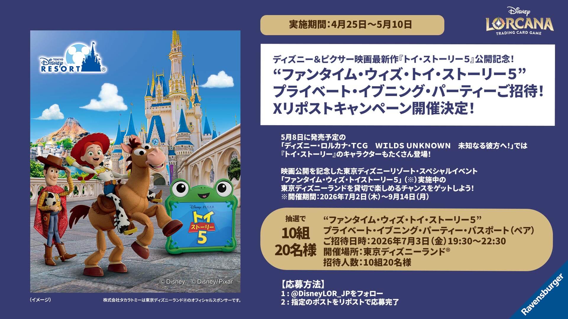 ディズニーロルカナ公式Xアカウント( https://x.com/DisneyLOR_JP )の対象の投稿をリポストいただくと抽選で10組20名様に“ファンタイム・ウィズ・トイ・ストーリー5”プライベート・イブニング・パーティー・パスポート(ペア)をプレゼント!