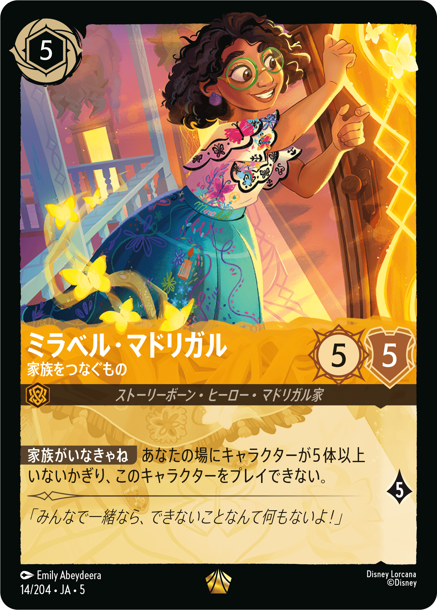 ですが、強力な効果にはそれに見合うだけのコストがかかります。《ミラベル・マドリガル – 家族をつなぐもの》は5枚のインクに加えて、自分の場にキャラクターが5体以上いないとプレイできません。早期にキャラクターを揃える必要があります。