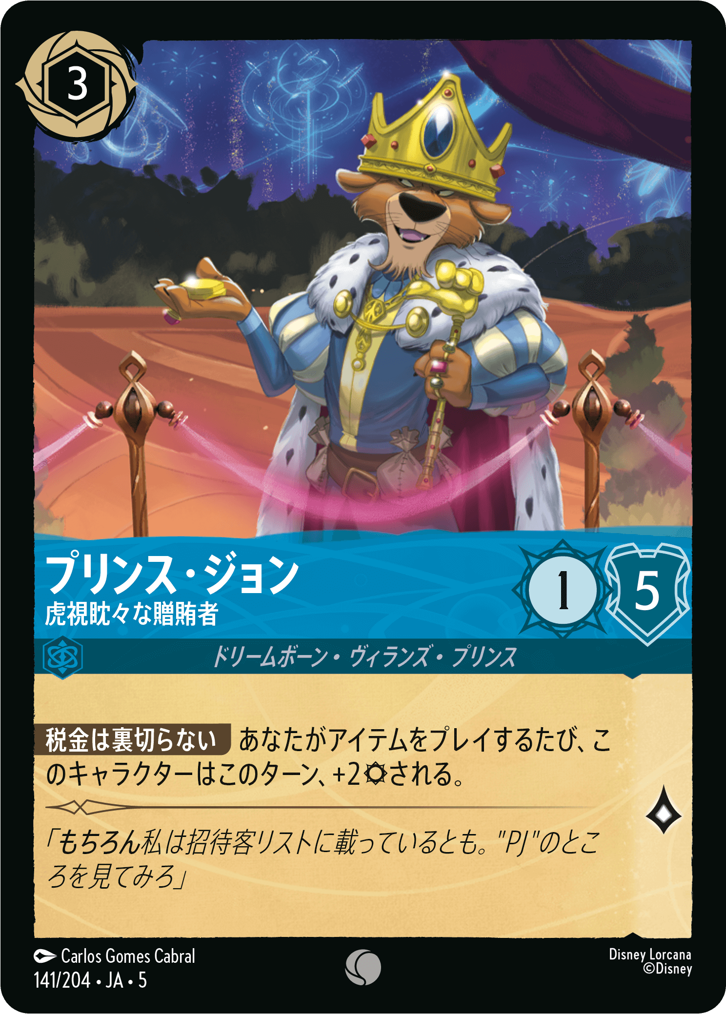 そこで活躍してくれるのが《プリンス・ジョン – 虎視眈々な贈賄者》です。攻撃力は1と低いものの、プレイしたアイテム1枚につき攻撃力が+2されます。高い意思力と相まって、対戦相手視点では一方的に自分のキャラクターがチャレンジで退場させられてしまうようにうつります。そのため相手のクエストを牽制し、ロアレース低速化に貢献してくれます。