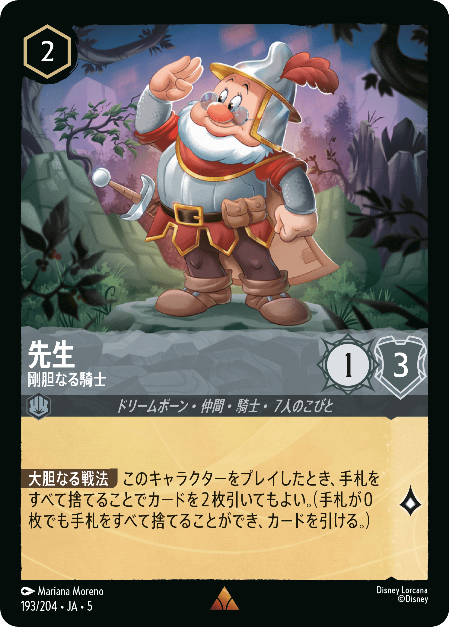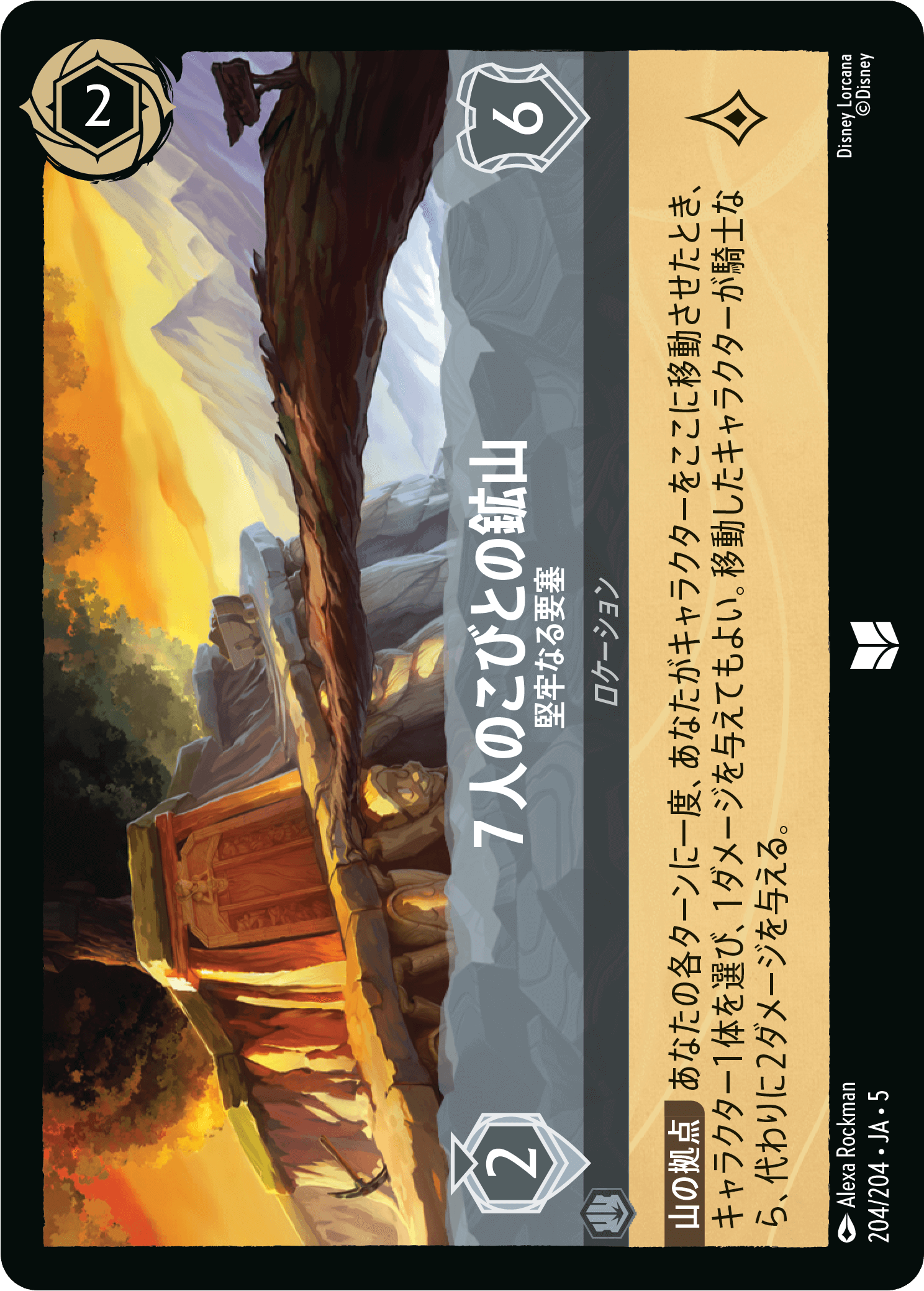 対戦相手の厄介なキャラクターを対処するのは《7人のこびとの鉱山 – 堅牢なる要塞》の仕事です。キャラクターを移動させることでチャレンジを介さずにダメージを与えられます。しかも《ごきげん – 軽快なる騎士》や《先生 – 剛胆なる騎士》ならば2点となり、場の優位を確立してくれます。