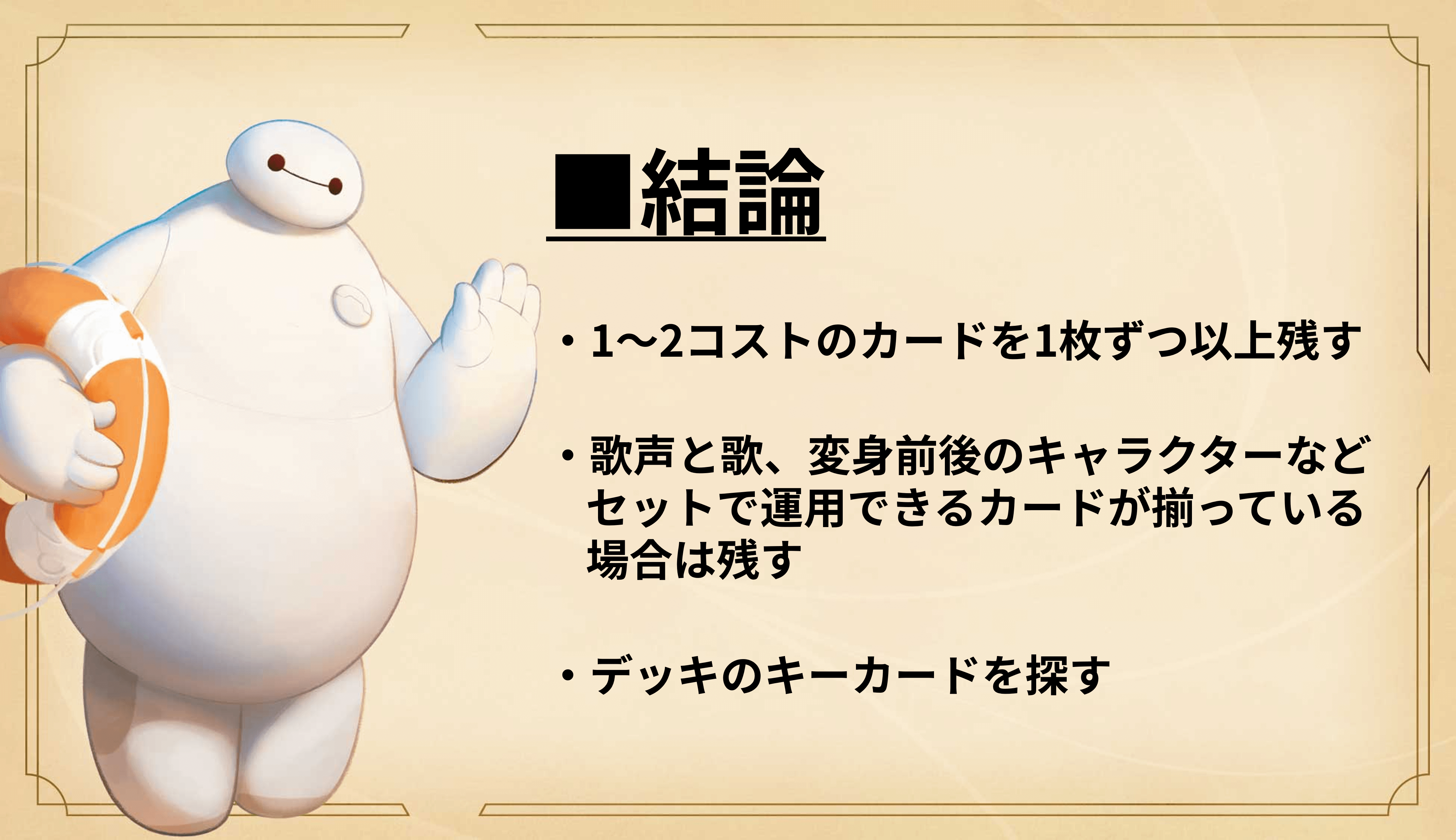 ディズニー・ロルカナ・TCGのマリガンは最大で7枚のカードを引き直せるため、上記のキーカードを引き込めるチャンスです。