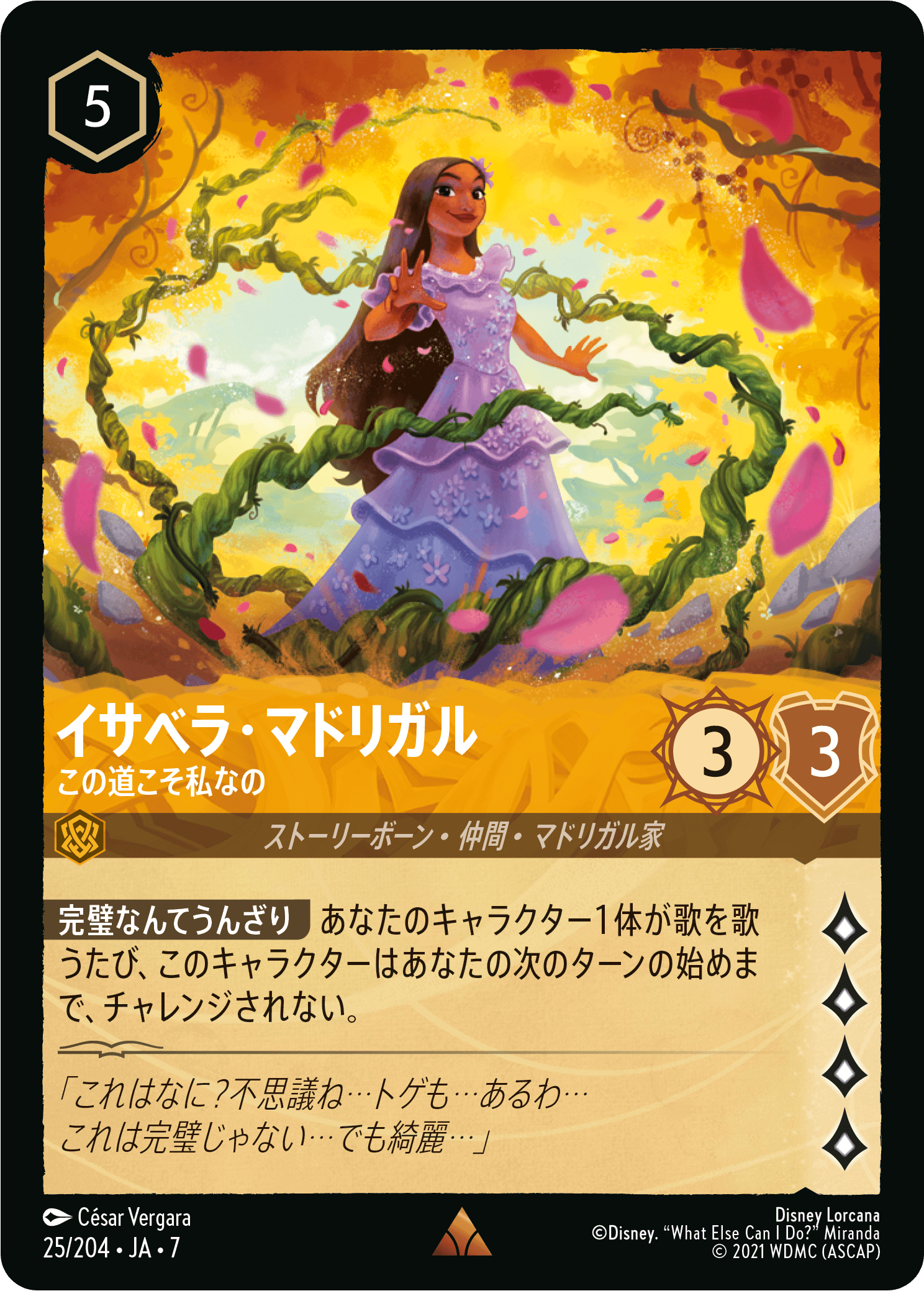反面、意思力の低さが弱点ですが、心配ありません。キャラクターが歌を歌えば、《イサベラ・マドリガル – この道こそ私なの》自身は次のターンまでチャレンジされないのです。