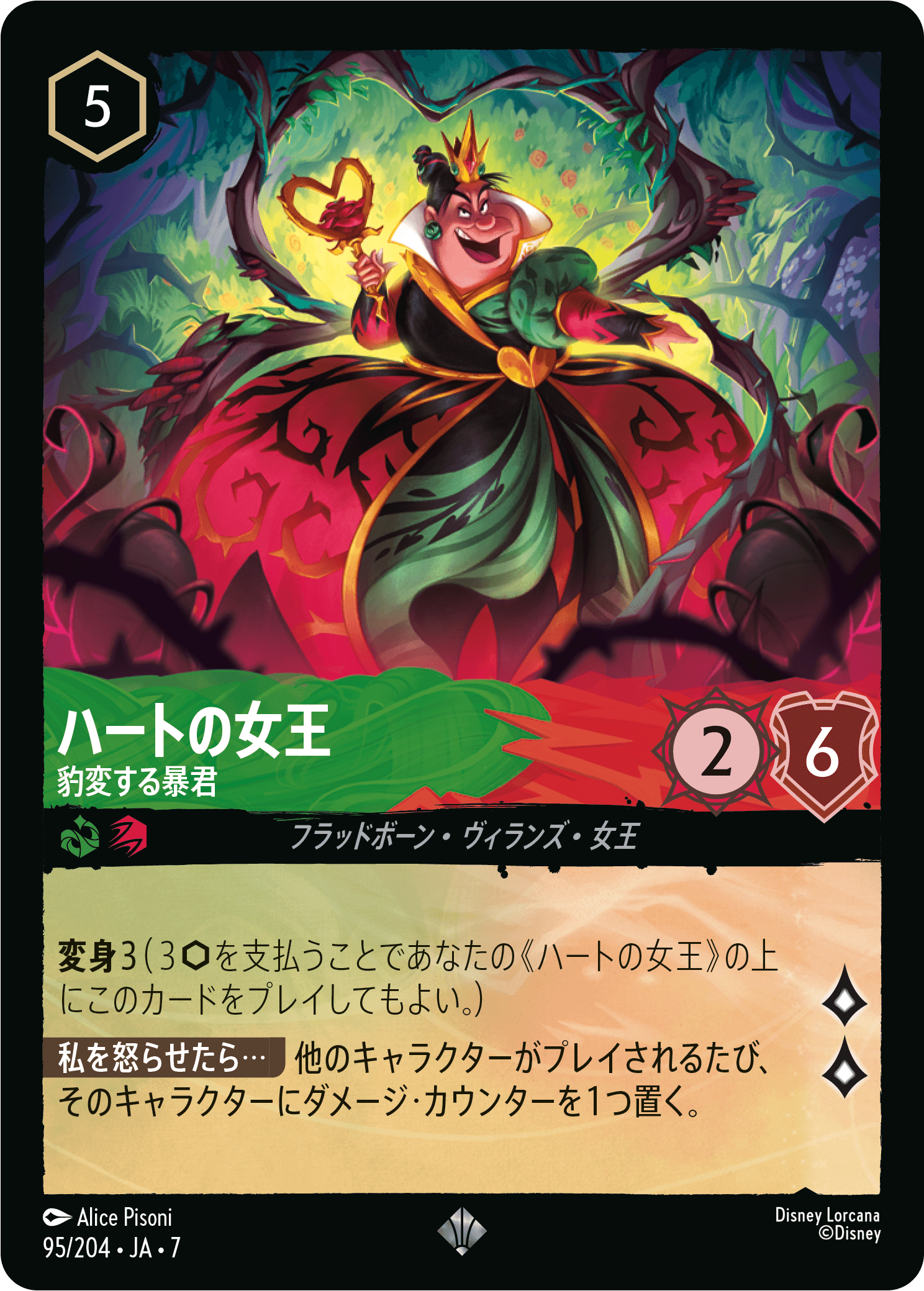 《ハートの女王 – 豹変する暴君》がいる限り、後続としてプレイされるキャラクターはダメージを負ってでることになります。意思力の低いキャラクターは盤面に残ることすらできません。