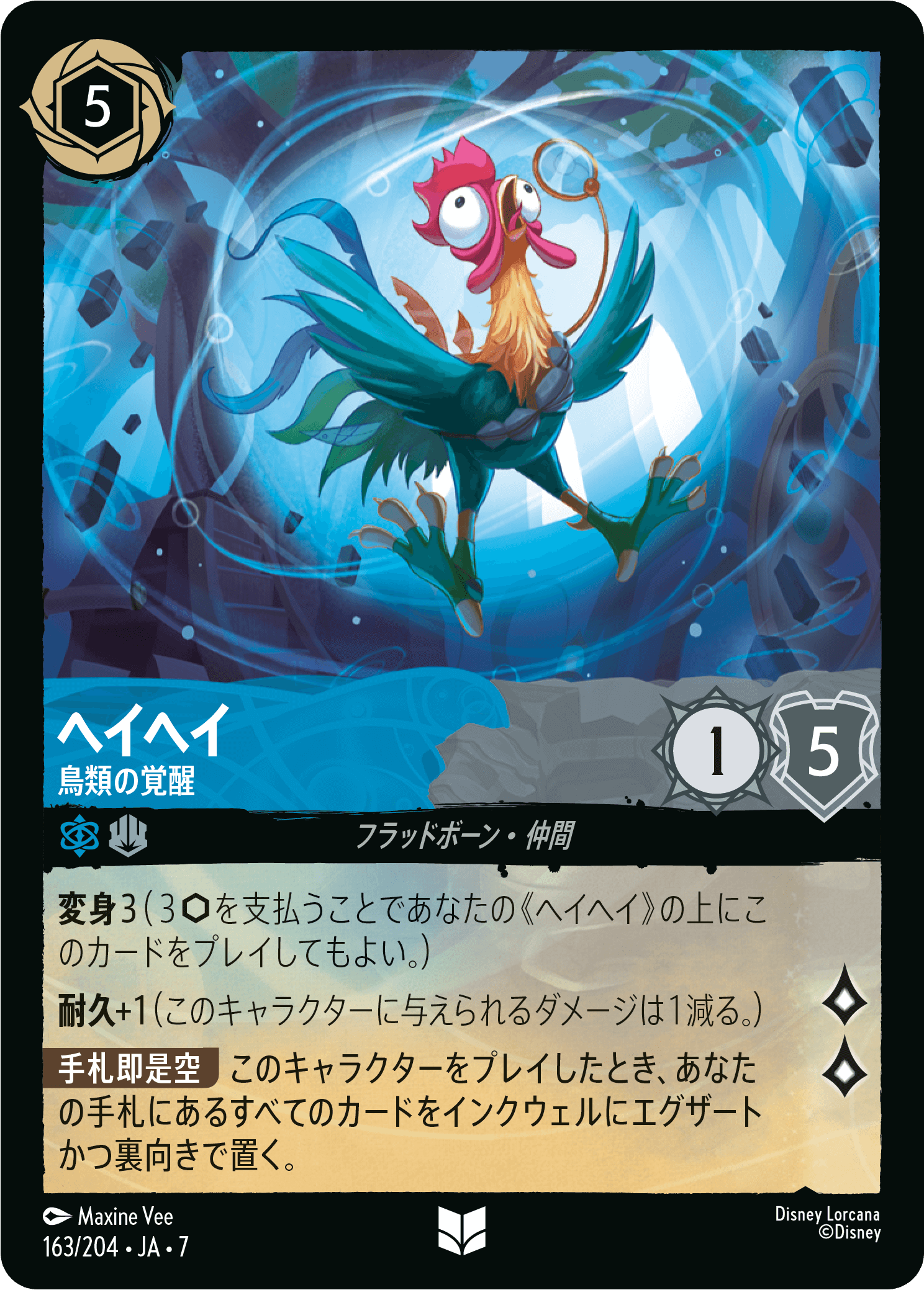 《ヘイヘイ – 鳥類の覚醒》は手札すべてをインクウェルに置く豪快なキャラクターです。一気に大量のインクブースト(カードの効果で使用できるインク数を増やすこと)ができ、次のターンからあらゆるカードが使えるはずです。