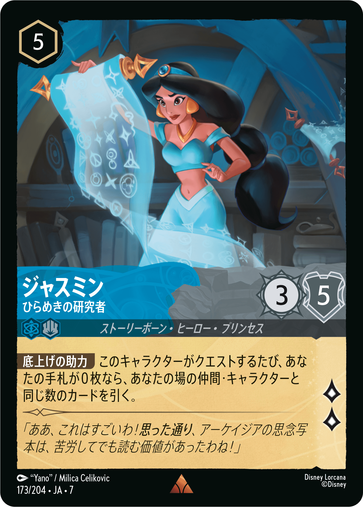 《ジャスミン – ひらめきの研究者》は、クエスト時その能力によって手札を増やすことができるカードです。仲間・キャラクターを場に展開していれば、一度に複数枚のカードを引くことができるのです。