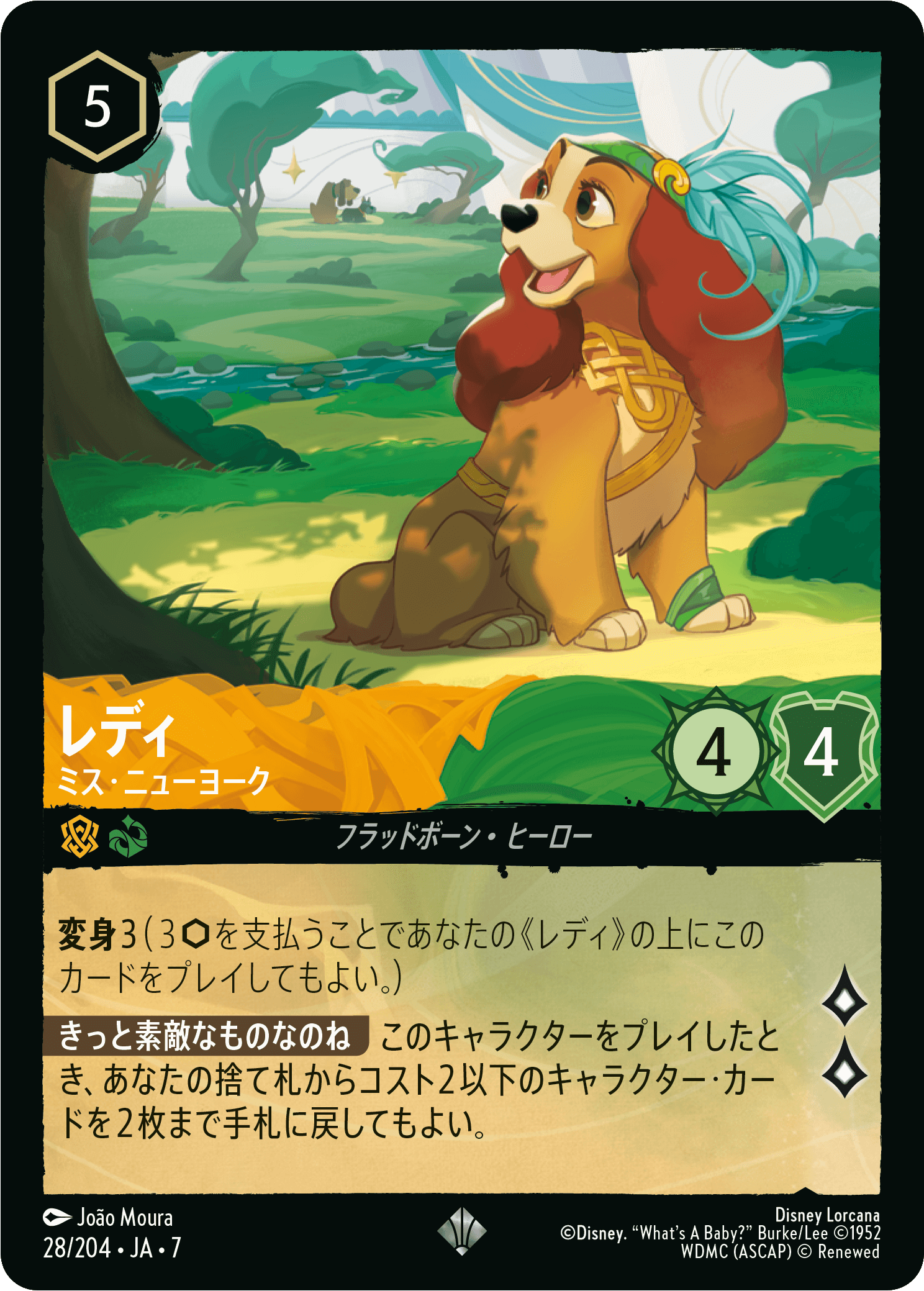 仮にキャラクターが退場してしまい、攻め手が途切れそうな場合には、《レディ – ミス・ニューヨーク》の出番です。5コストですが変身をもっており、見た目よりも少ないインクでプレイ可能です。