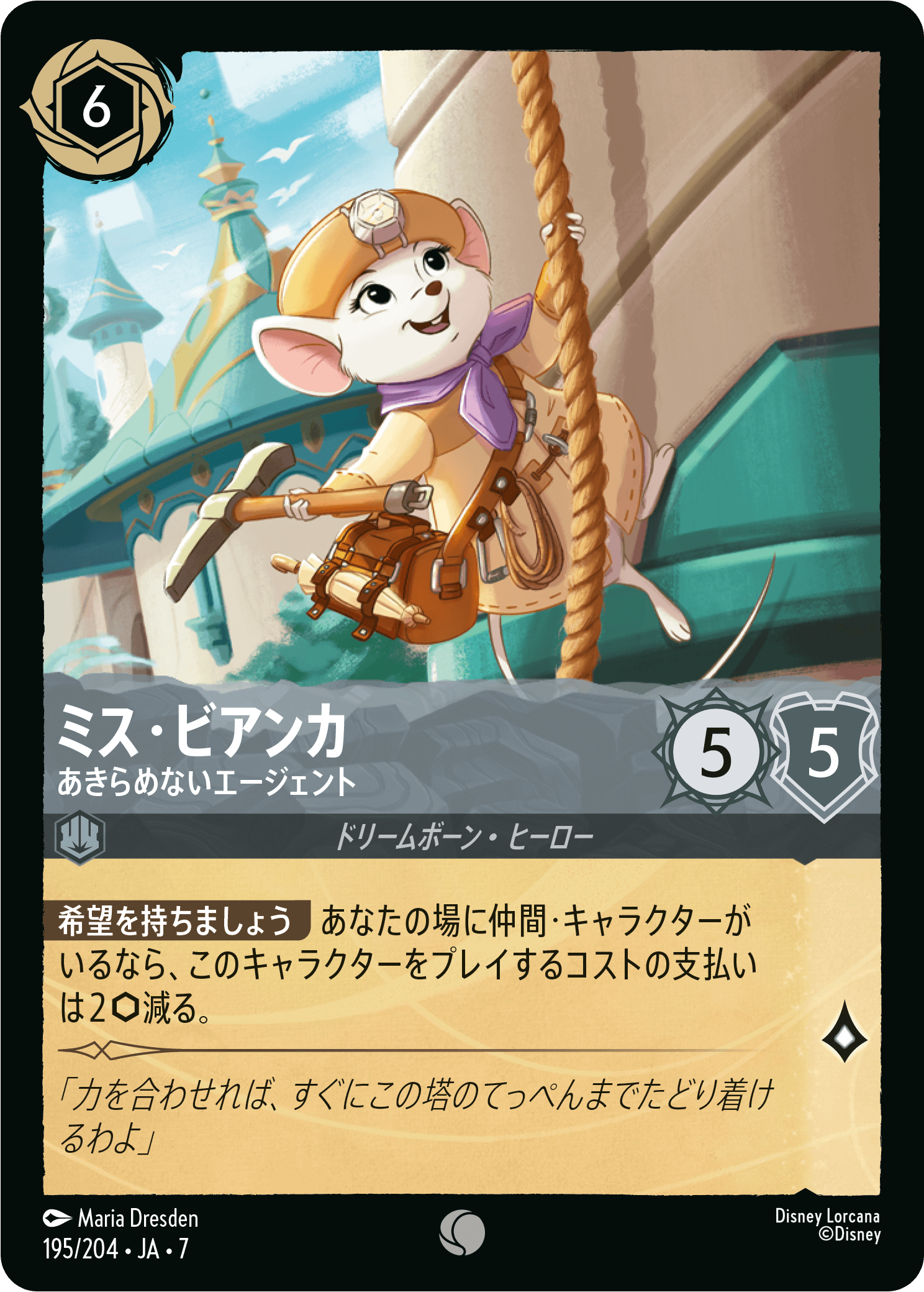 チャレンジによる盤面の取り合いで活躍が期待されるのは《ミス・ビアンカ – あきらめないエージェント》です。本来は6コストのキャラクターですが、場に仲間・キャラクターがいれば4コストでプレイできます。攻撃力と意思力は5もあり、4コストとしては破格の性能です。