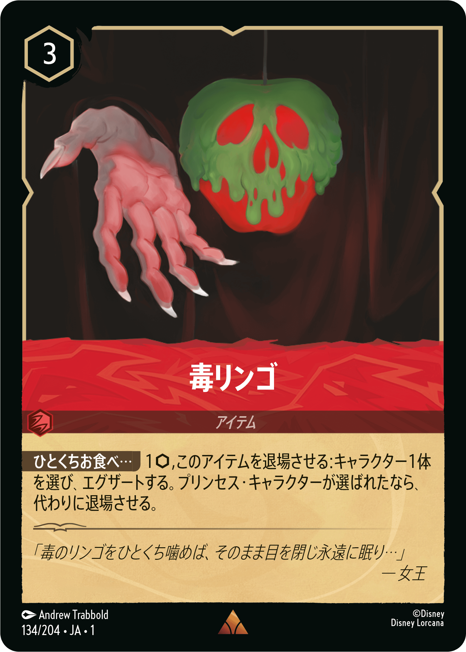 ニシオカ「元々『アーケイジアと魔法の島』以前からルビー/サファイアを好んで使っていました。インクブースト(カードの効果で使用できるインク数を増やすこと)ができるため、後攻のときでも対戦相手に追いつけチャンスを作りやすいデッキだからです。今回は《ピート – リングのレフェリー》を使ったスティール系の増加が予想されたので、その対策として《ハデス – 冥府の策謀家》や《毒リンゴ》を採用し、盤面干渉をアクション・カード頼みにならにように調整しました」