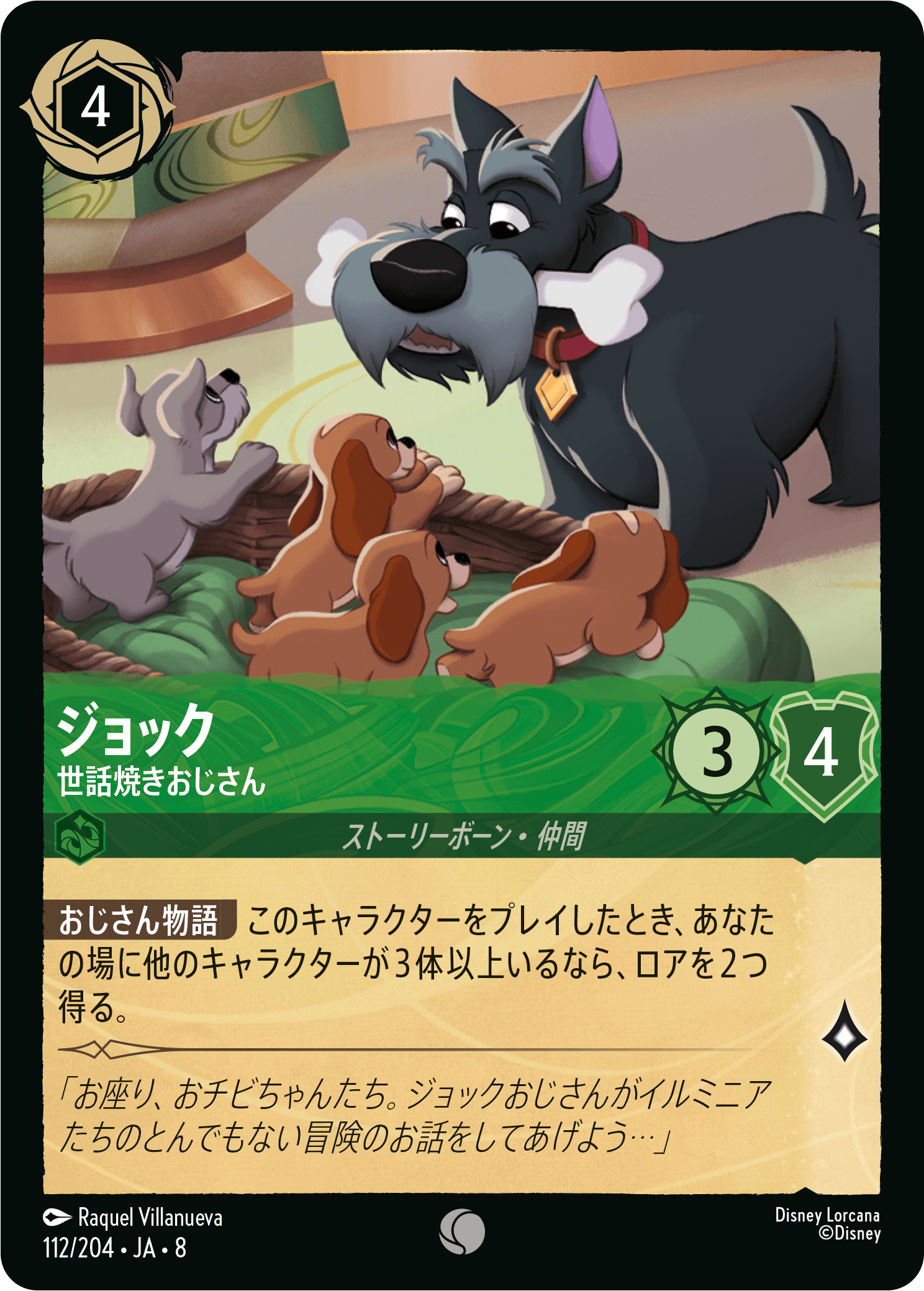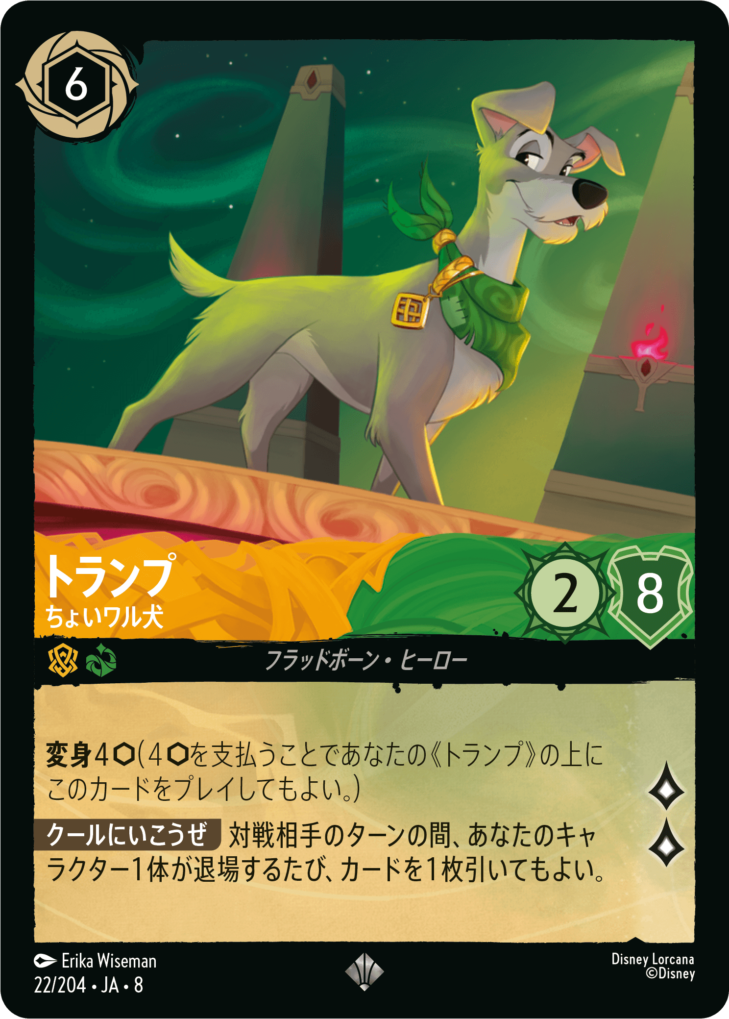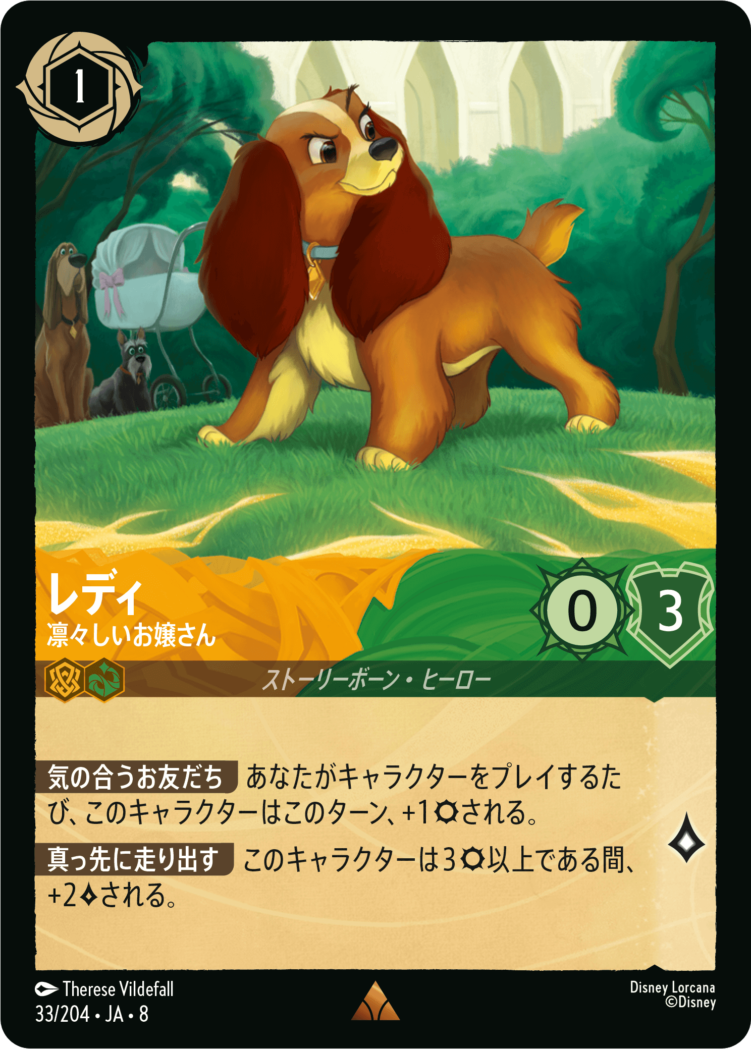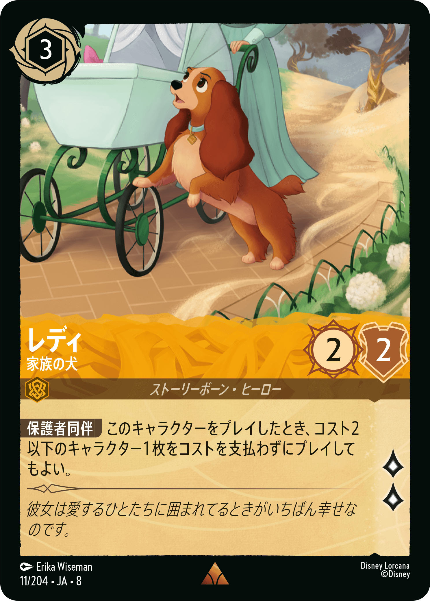 《レディ – 家族の犬》はまさに「アンバー/エメラルド チェルナドッグ」が求めていたキャラクターです。3コストで実質5コスト分の働きをし、一度に2体のキャラクターを展開できます。展開力で差をつけられますし、ロア値も高め。アンバー系のデッキで定番の3コストキャラクターとなりそうです。