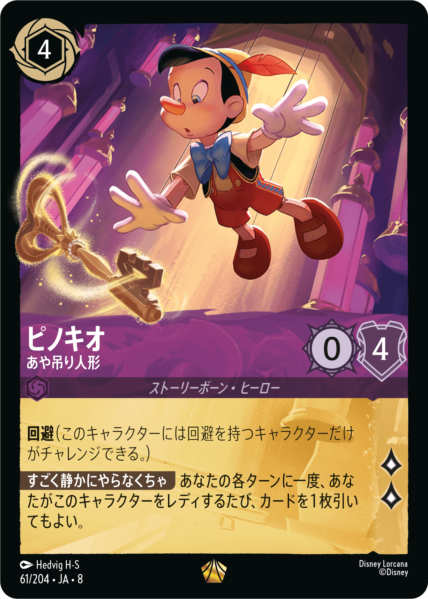 《ピノキオ – あや吊り人形》は4コストなのに攻撃力0。ロア値こそ高いものの、盤面の取り合いには不向きです。このカードの真価はこのキャラクターをレディしたときにあります。各ターンに一度、レディするたび、カードを引けるのです。