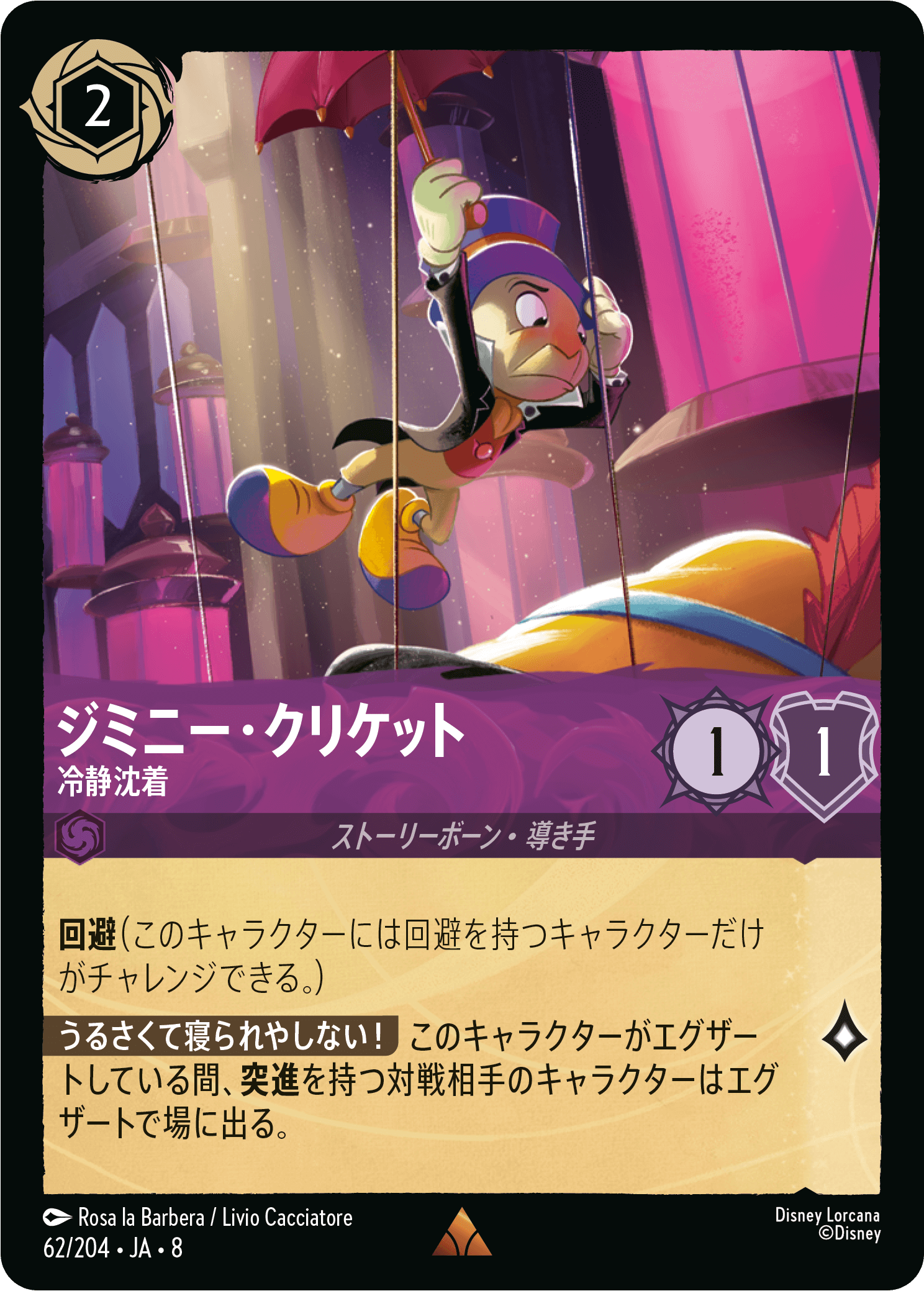 《ジミニー・クリケット – 冷静沈着》は攻撃力と意思力の低さが気になりますが、それを補って余りある能力を持っています。《ジミニー・クリケット – 冷静沈着》がエグザートしている間、対戦相手の突進を持つキャラクターはエグザート状態で場に出ることになります。突進を無効化すると同時に、先に自分がチャレンジするチャンスが得られます。