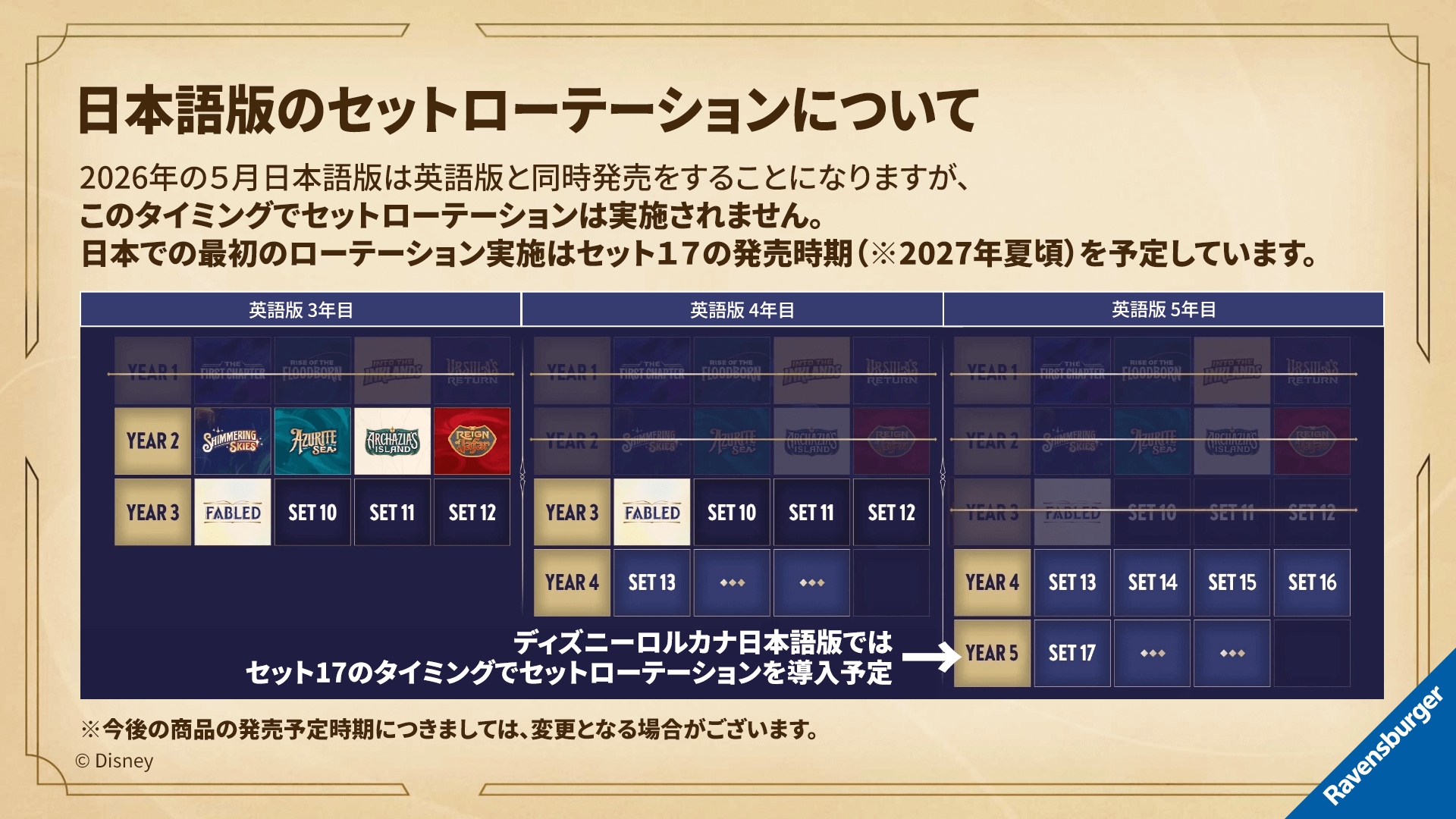 英語版のセットローテーション導入決定を受け、2025年5月にディズニーロルカナ日本語版公式HPにおいて、「英語版ディズニーロルカナにてコアフォーマットにおけるセットローテーションが発表されましたが、 日本語版の発売時期が英語版に追いつくまでコアフォーマットにおけるセットローテーションは実施されません」とお知らせを発表しました。