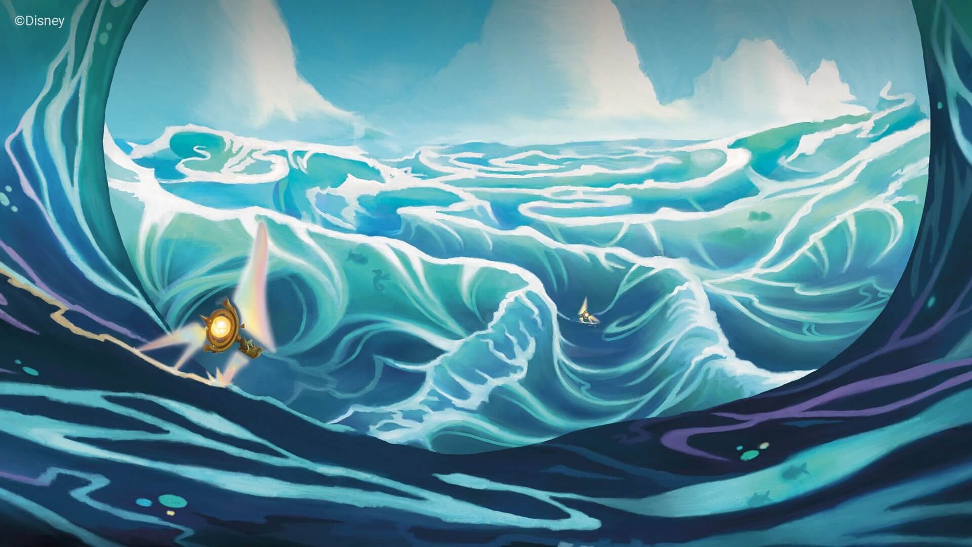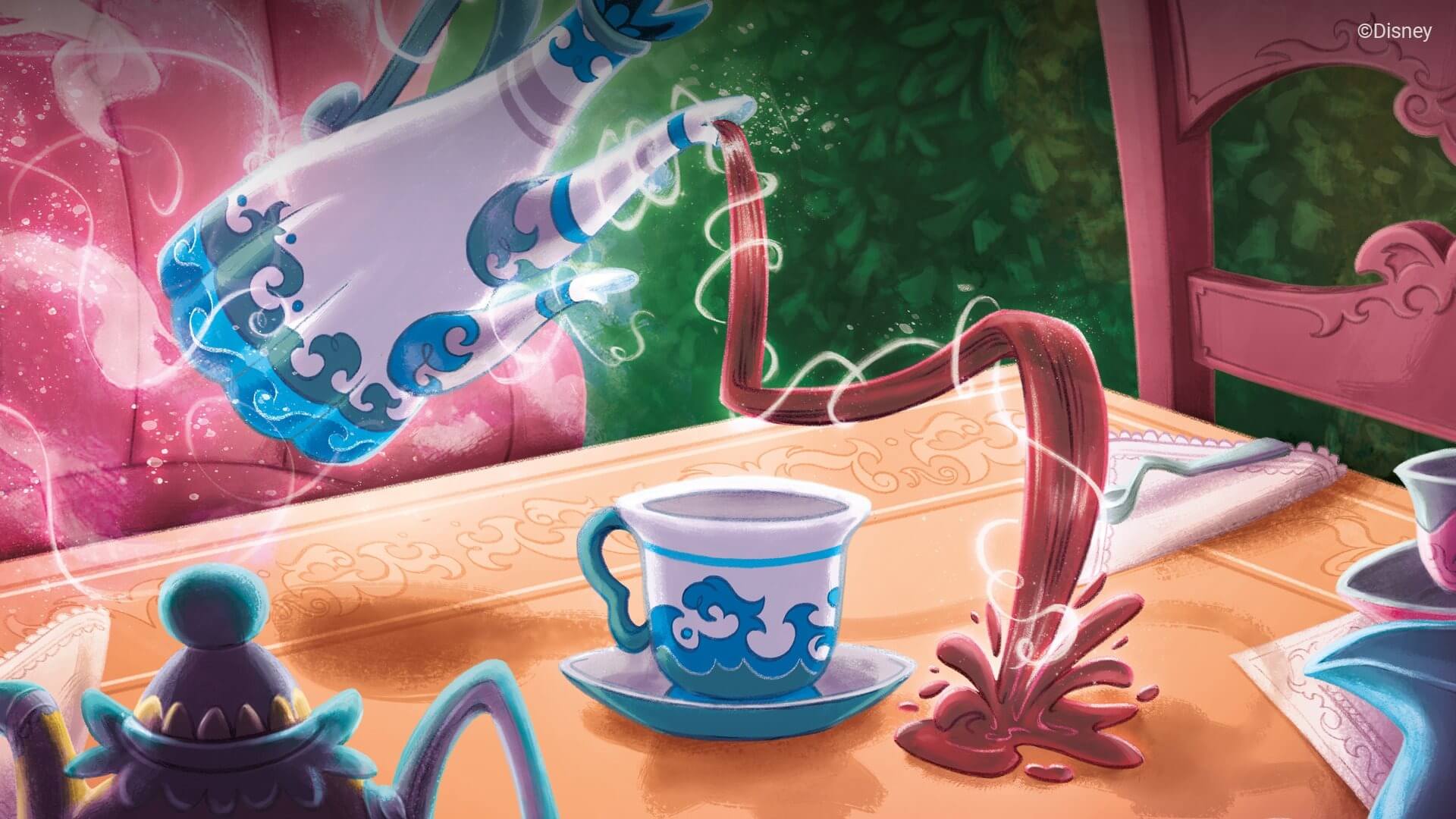 「俺のティーポットが!俺のティーポットが!」アズライト海の岸辺から、マッドハッターのグリマーが叫んでいました。アリスのグリマーが彼の指さす方向を見やると、遠くの波間に青と白のティーポットがぷかぷかと浮かんでいるのが見えました。