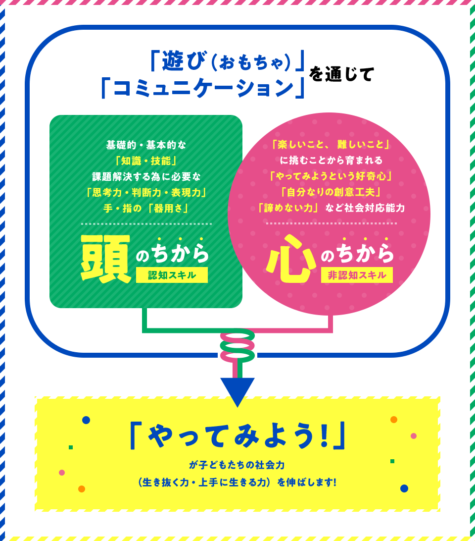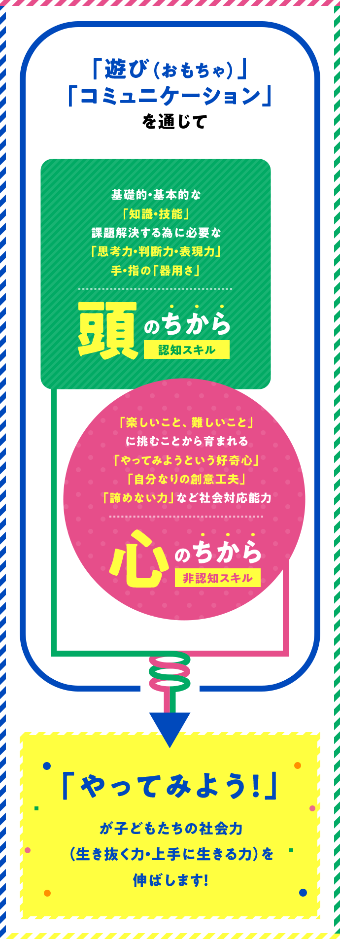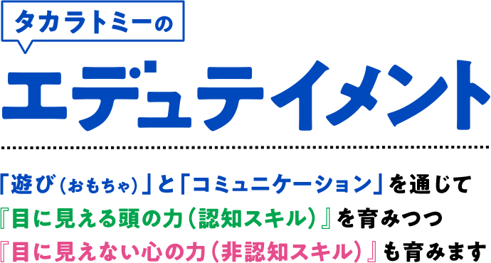 今、世界中の国々が教育の仕方を21世紀型に急いで移行しようとしています。その最大のテーマは、社会にでたときに実際に使う仕事力・人間力の基礎を子どものときにこそ育てようというもので、その内容は遊びとその工夫の中で培われる集中力やアイデア力、相談力、粘り強さ、コミュニケーション力などの育成です。これらを「非認知的能力(スキル)」と呼んでいるのですが、この力と従来の学力につながる「認知的能力(スキル)」の基礎をあわせて育てようというのがエデュテイメントだと思います。この二つがバランスよく育つことが子どもたちの将来のしあわせの条件なのですね。