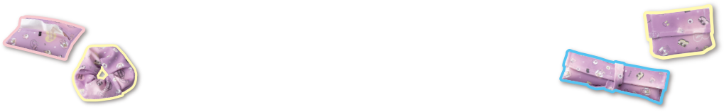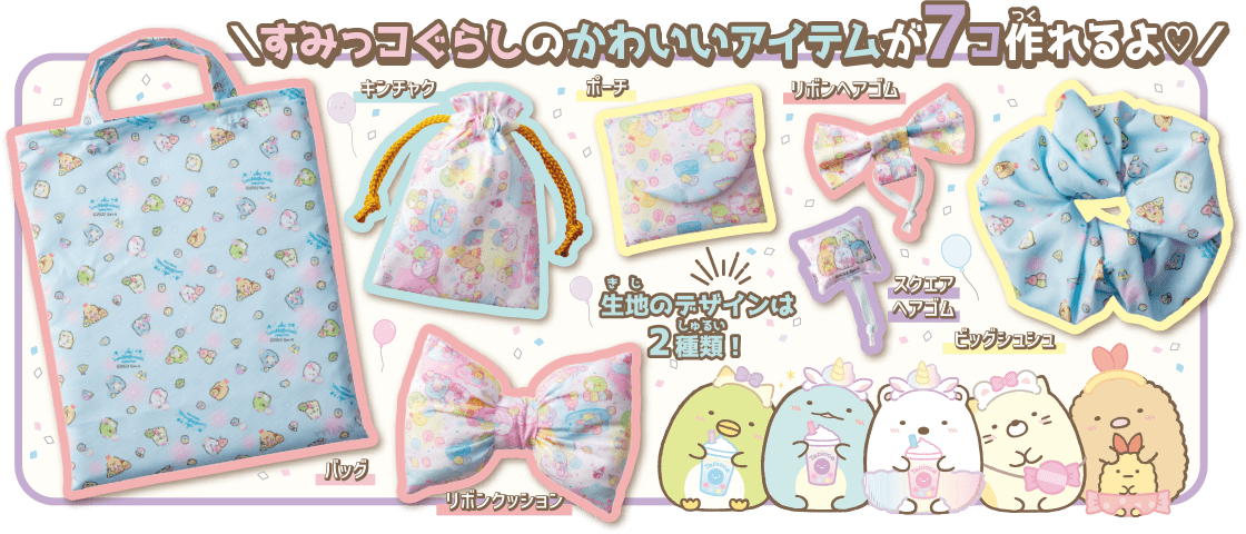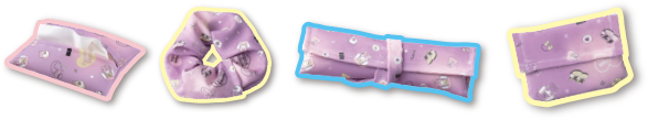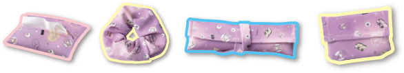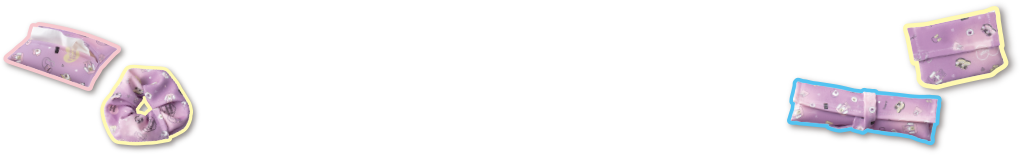 セット内容の生地で①トートバッグ②ティッシュケース③ロールペンケース④シュシュ⑤ポーチが作れるよ!