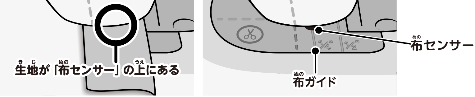 また、生地が「布ガイド」より内側にある場合、「布センサー」が反応しない場合があります。ファッションスタジオが途中で止まってしまった場合は、センサー部に生地が2枚以上あることを確認してください。
