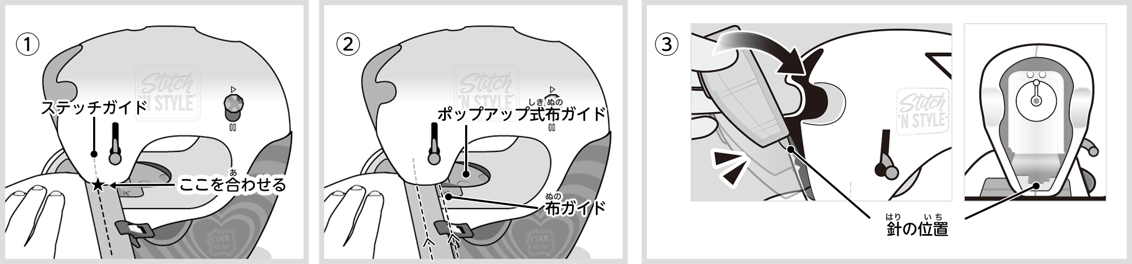 ③ 曲線を縫う時は、縫う線(〇――――□)を「ステッチガイド」の約2cmほど奥にある“針”の位置にあわせるようにすると縫いやすくなります。