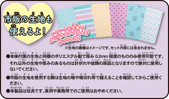 ※市販の生地を使用する場合は、生地の端や端切れ等で縫えることを確認してからご使用ください。