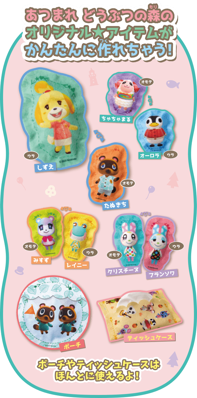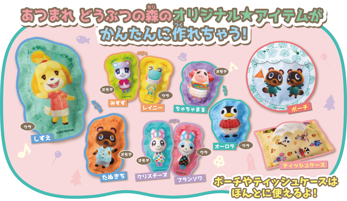 「あつまれ どうぶつの森」のかわいい小物がたっぷりつくれる商品です。トートバッグや、ミニバッグ、小物入れなど日常生活で実際に使えてとても便利な小物がたっぷり作れます!