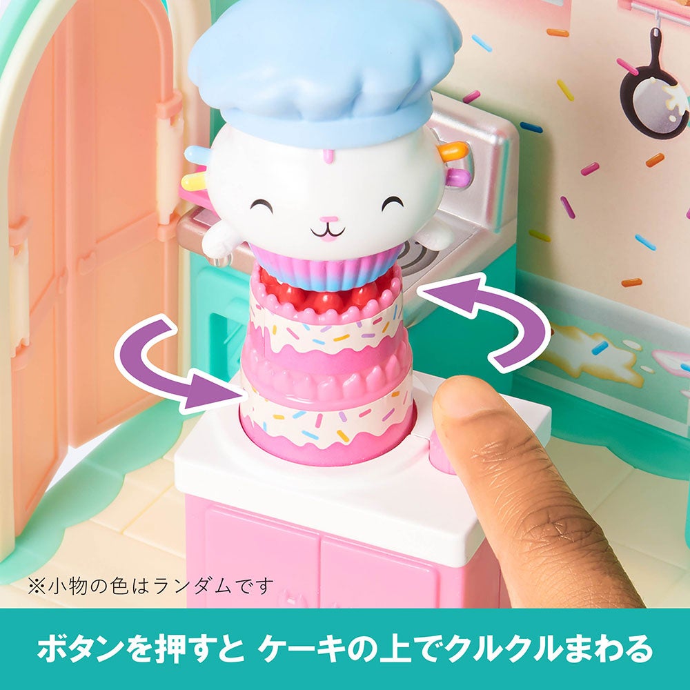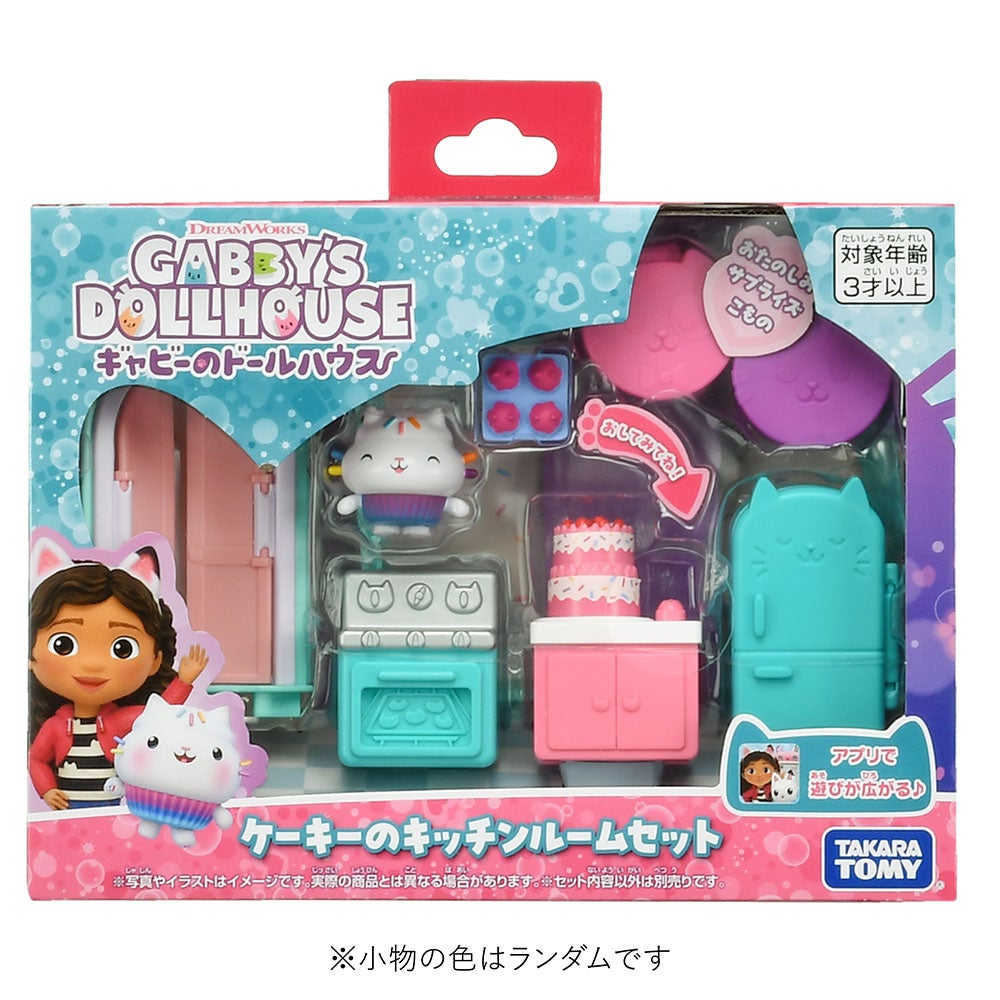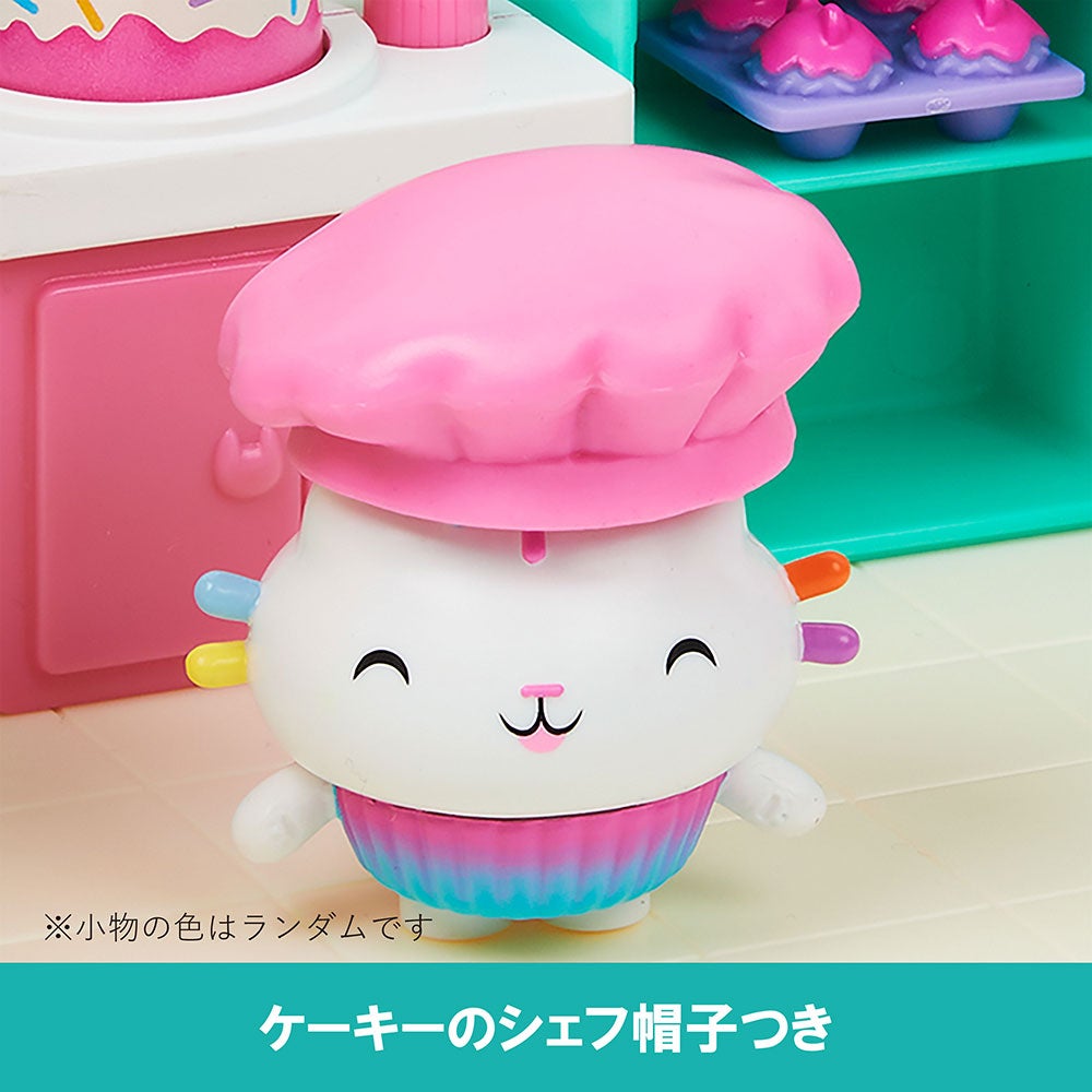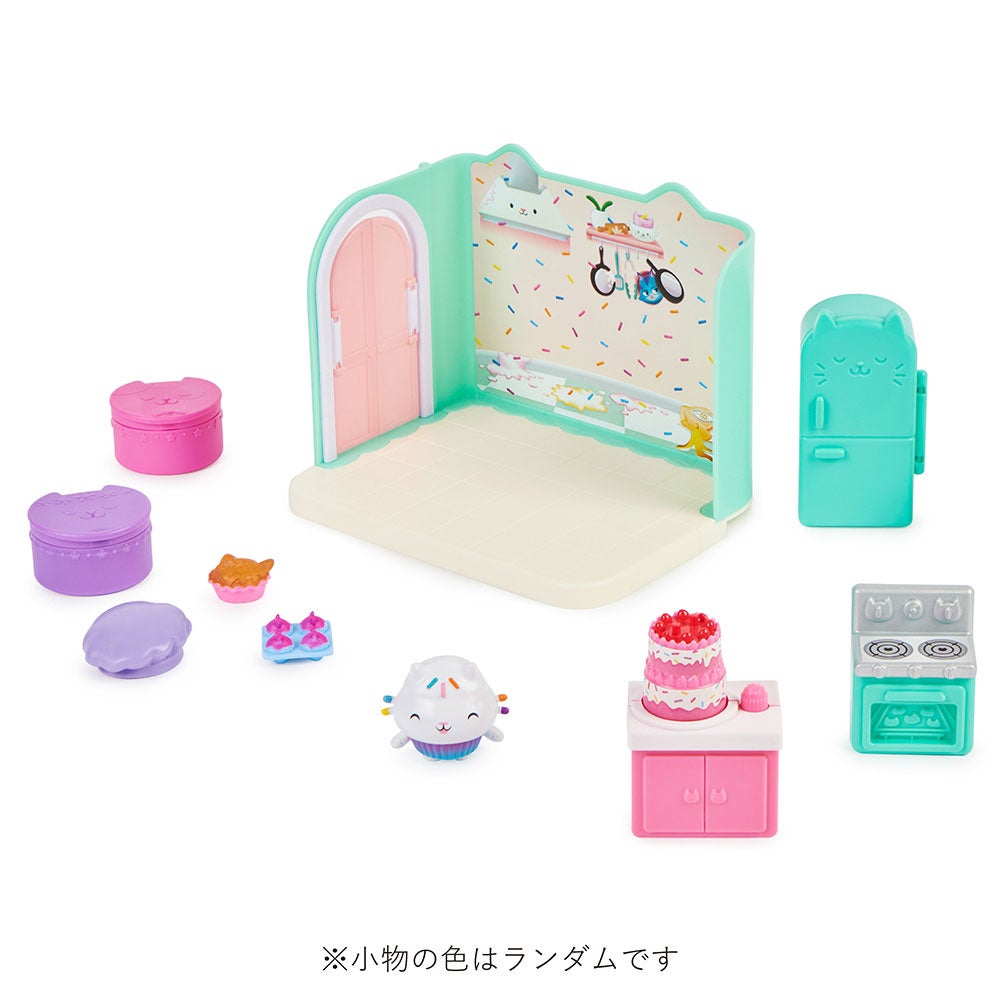 セット内容:ドア(1)、壁(1)、床(2)、たな(1)、オーブン(1)、れいぞうこ(1)、サプライズこもの(ぼうし)(1)、サプライズこもの(パイ)(1)、フィギュア(1)、カップケーキトレー(1)、ネコちゃんボックス(2)、取扱説明書(1)