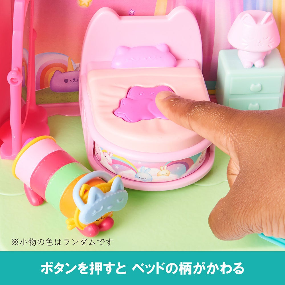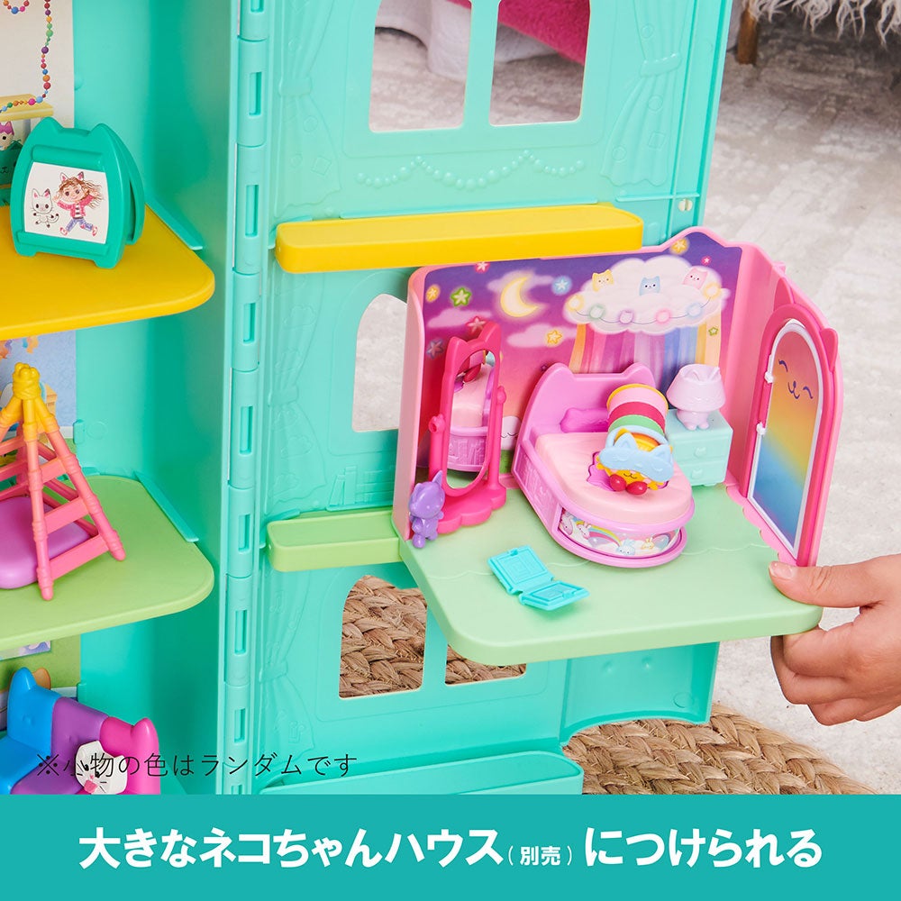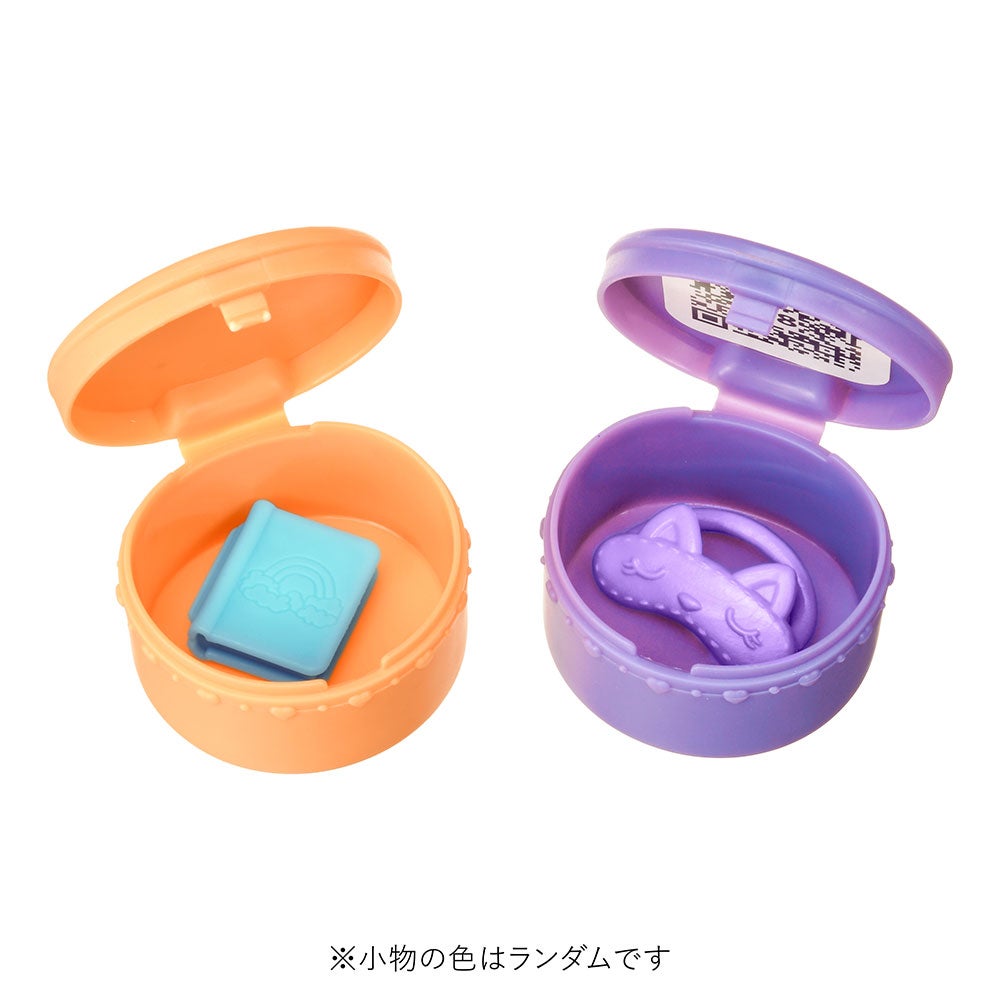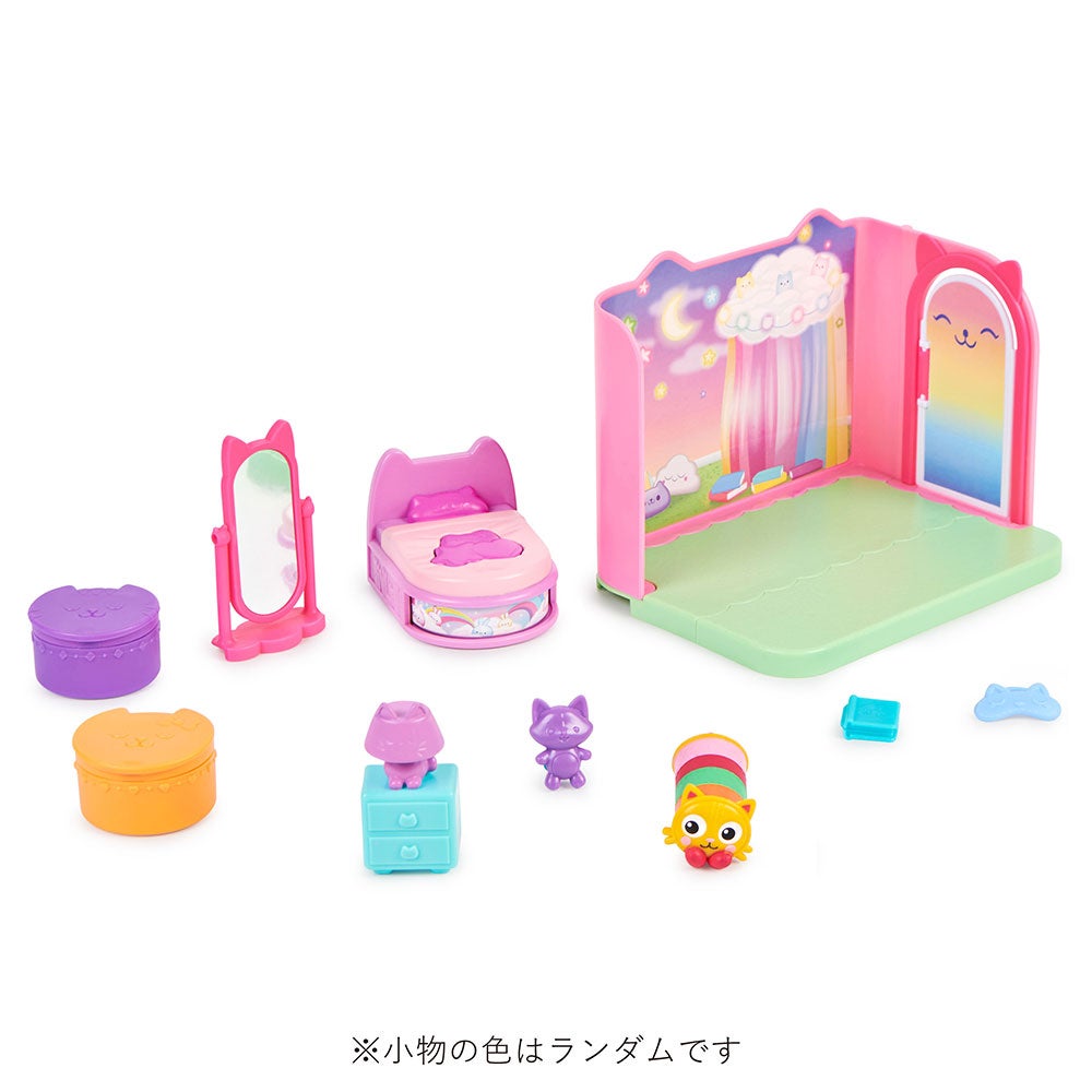 セット内容:壁(1)、ドア(1)、床(2)、サプライズこもの(アイマスク)(1)、サプライズこもの(えほん)(1)、ベッド(1)、チェスト(1)、かがみ(1)、フィギュア(1)、ぬいぐるみ(1)、ネコちゃんボックス(2)、取扱説明書(1)