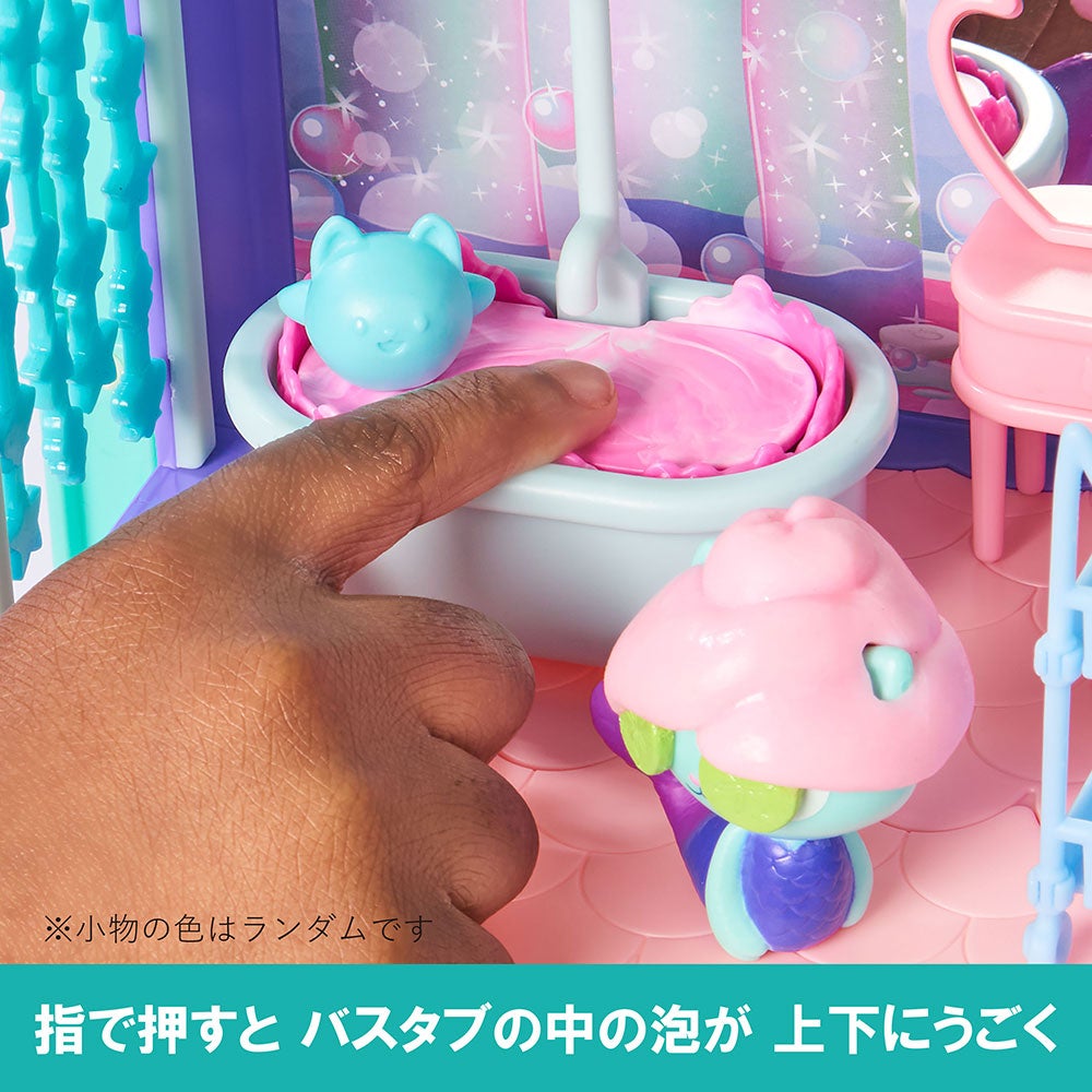 セット内容:壁(1)、カーテン(1)、床(2)、おふろ(1)、ラック(1)、ドレッサー(1)、サプライズこもの(コロン)(1)、サプライズこもの(アイマスク)(1)、フィギュア(1)、ネコちゃんフロート(1)、ネコちゃんボックス(2)、取扱説明書(1)