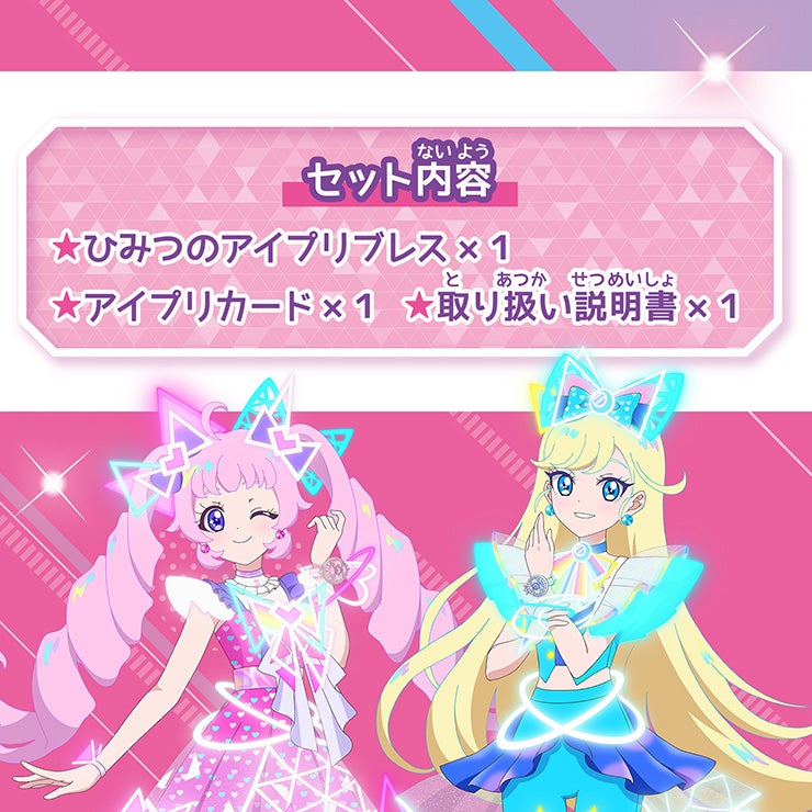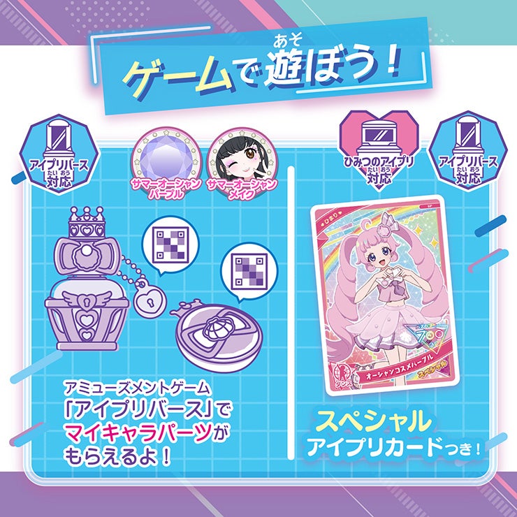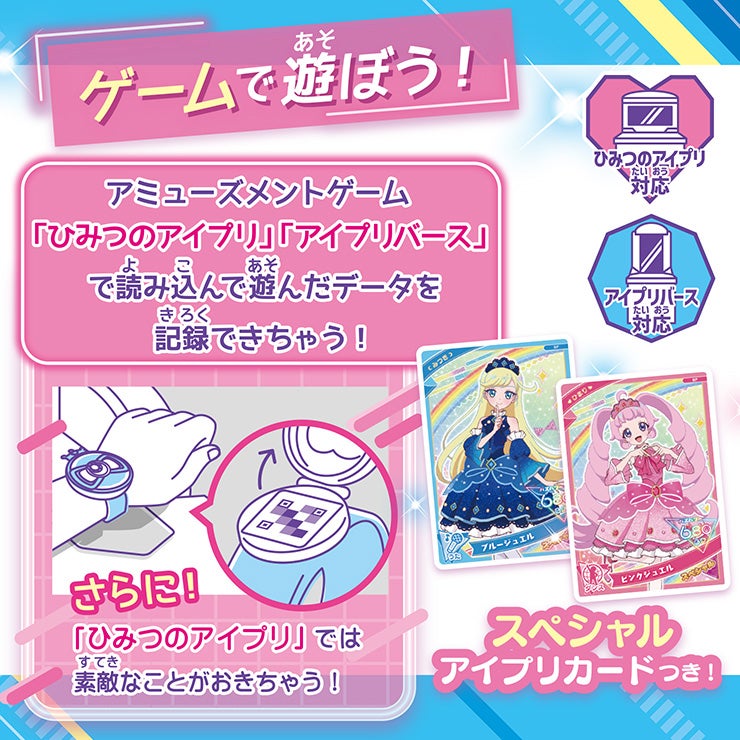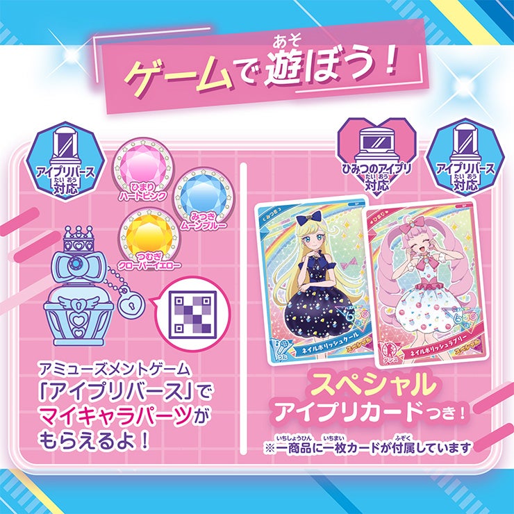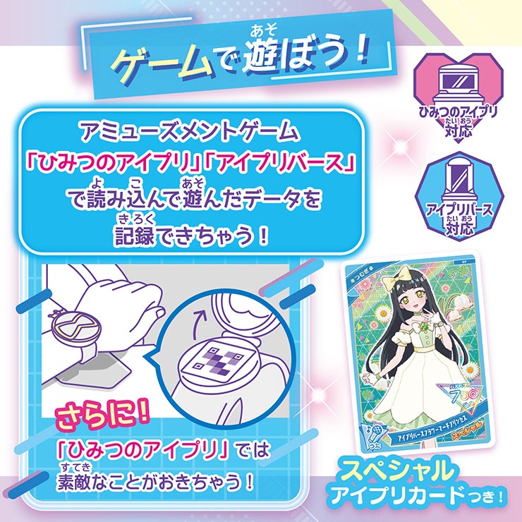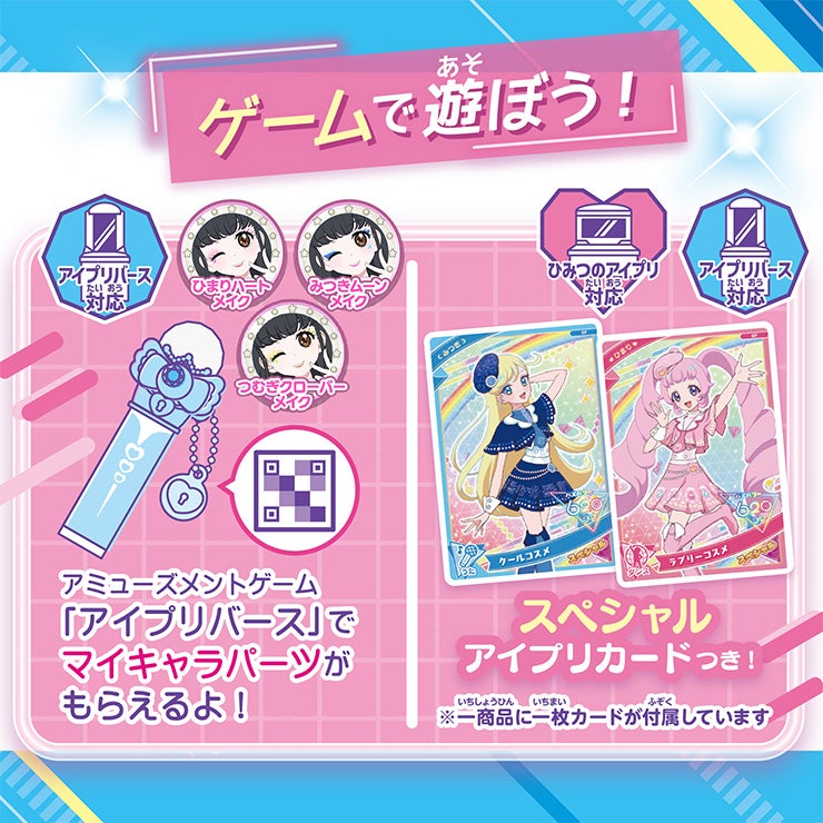 2種類のアミューズメントゲーム「ひみつのアイプリ」「アイプリバース」で遊べるスペシャルデザインのアイプリカード付き。