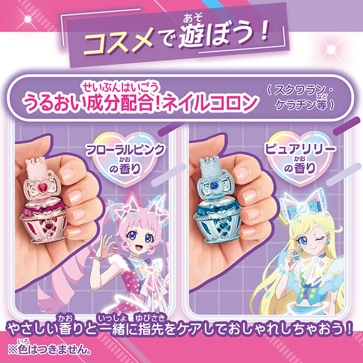 コンパクトとネイルコロンに付属する2次元コード(プレゼントコード)をアミューズメントゲーム「アイプリバース」にかざすとマイキャラパーツがもらえます。