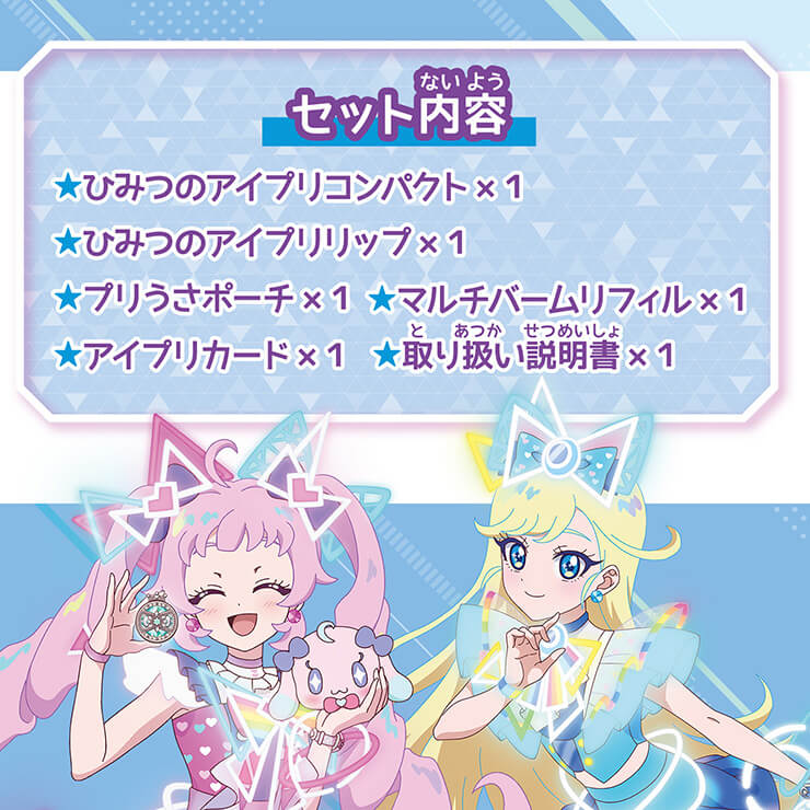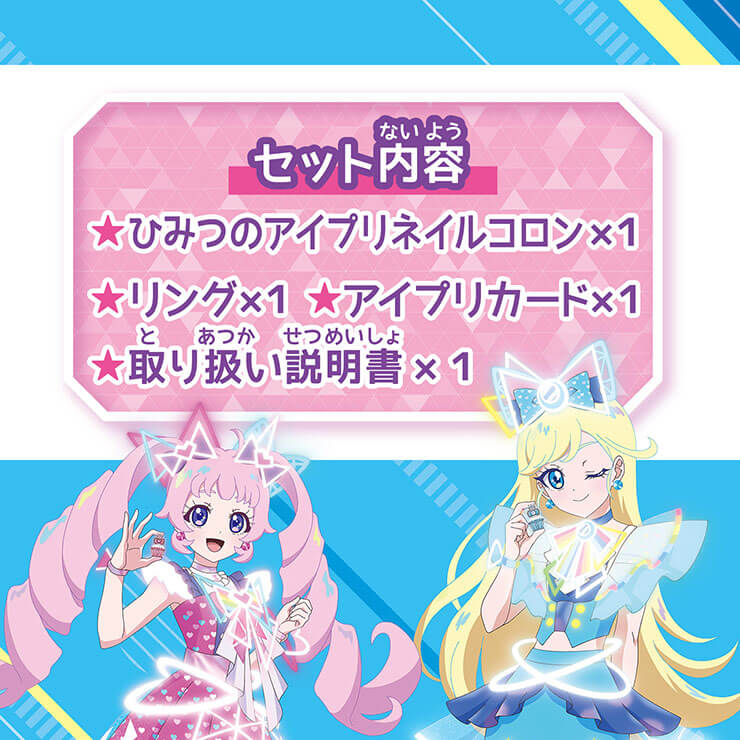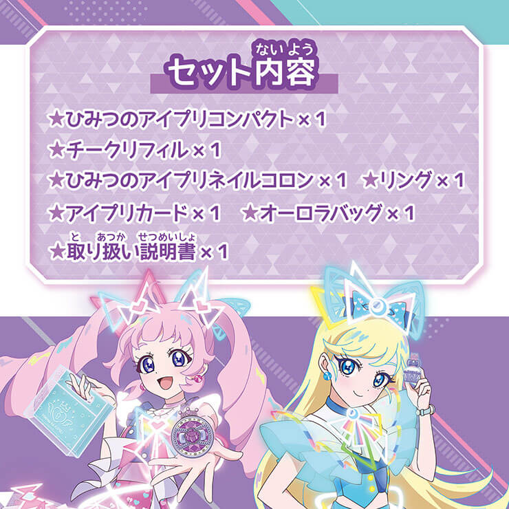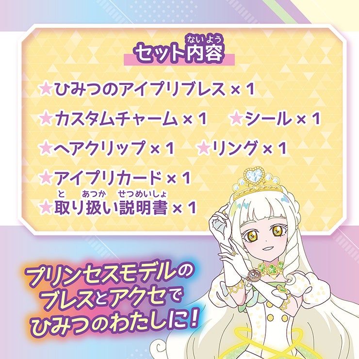 ひみつのアイプリブレスとブレスをさらにかわいくするカスタムチャームとシール、ヘアクリップ、リング、シール、アイプリカード1枚が入ったセットです。