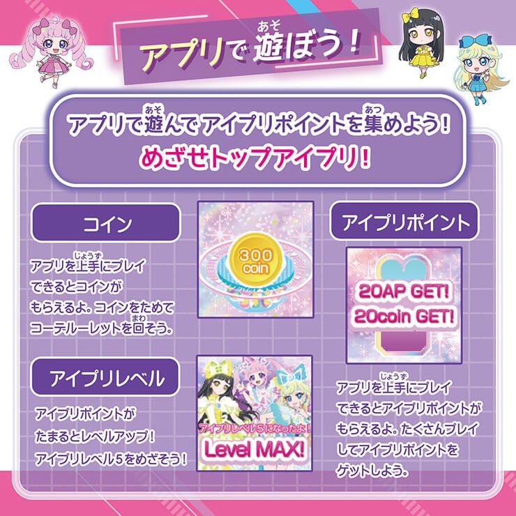 アミューズメントゲーム「ひみつのアイプリ」「アイプリバース」と通信させると、ハートポッドで使えるコインやポイント、コーデをゲット。