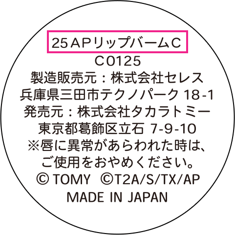 コスメの成分についてお問い合わせがある場合、コスメ底面に貼ってあるシールの一行目にある販売名(例:25APリップバームC)を事前にご確認ください。