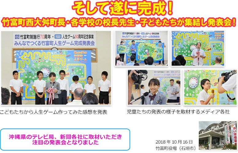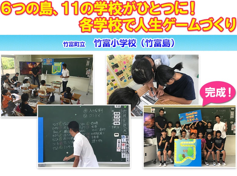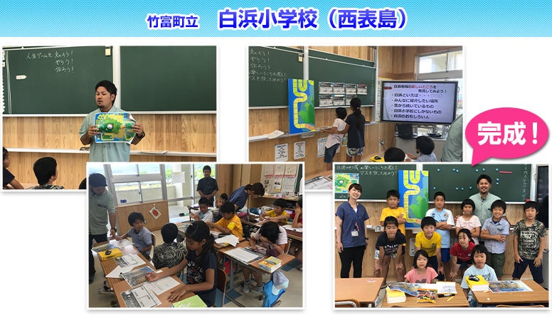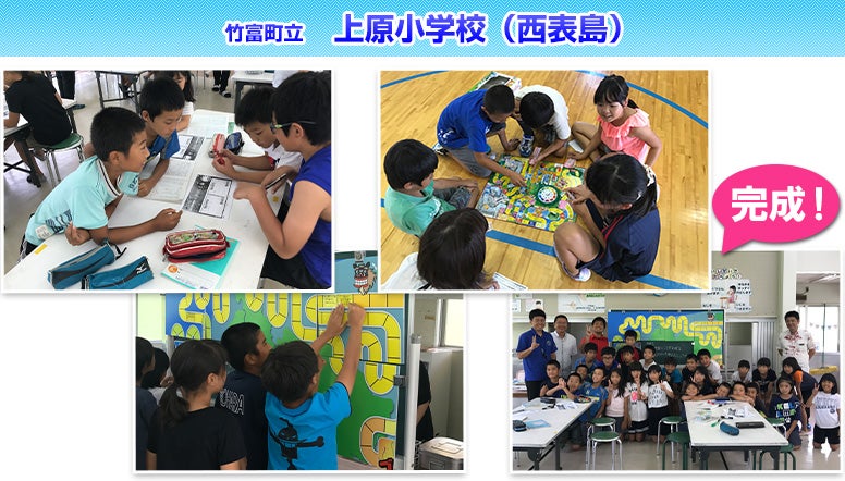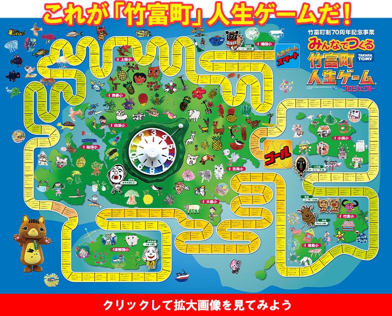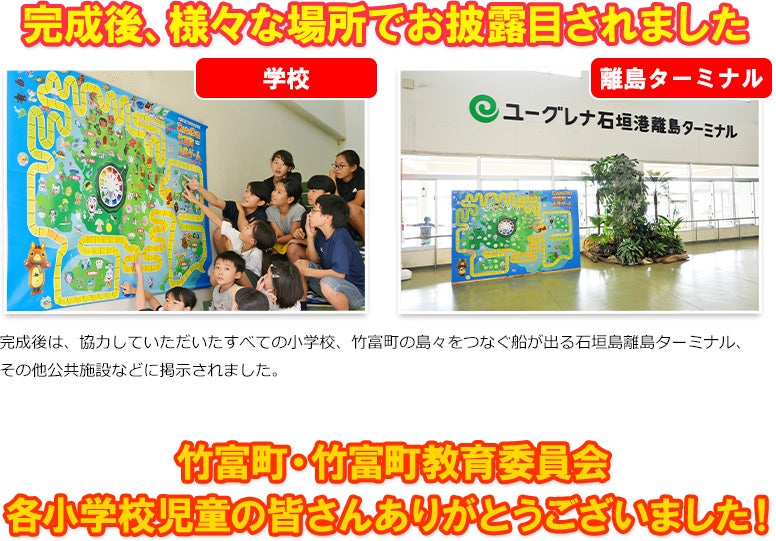 日本最南端 竹富町の島々 6つの島、11の学校がひとつに!各学校で人生ゲームづくり 竹富町立 竹富小学校(竹富島) 竹富町立 白浜小学校(西表島) 竹富町立 上原小学校(西表島) そして遂に完成!竹富町西大舛町長・各学校の校長先生・子どもたちが集結し発表会! これが「竹富町」人生ゲームだ! 製作にご協力いただいた皆様 完成後、様々な場所でお披露目されました。完成後は、協力していただいたすべての小学校、竹富町の島々をつなぐ船が出る石垣島離島ターミナル、その他公共施設などに掲示されました。竹富町・竹富町教育委員会、各小学校児童の皆さんありがとうございました! 戻る